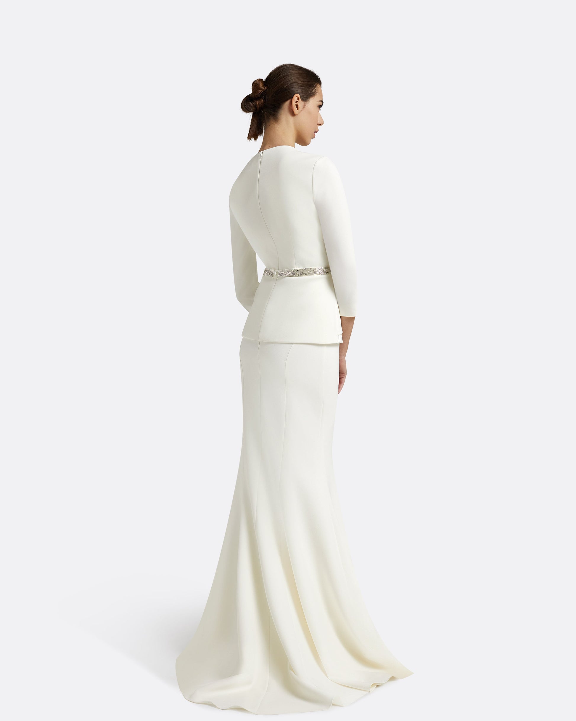 Foldover peplum top with sleeves and scooped round neck in ivory Heavy Crepe and Shine Satin.