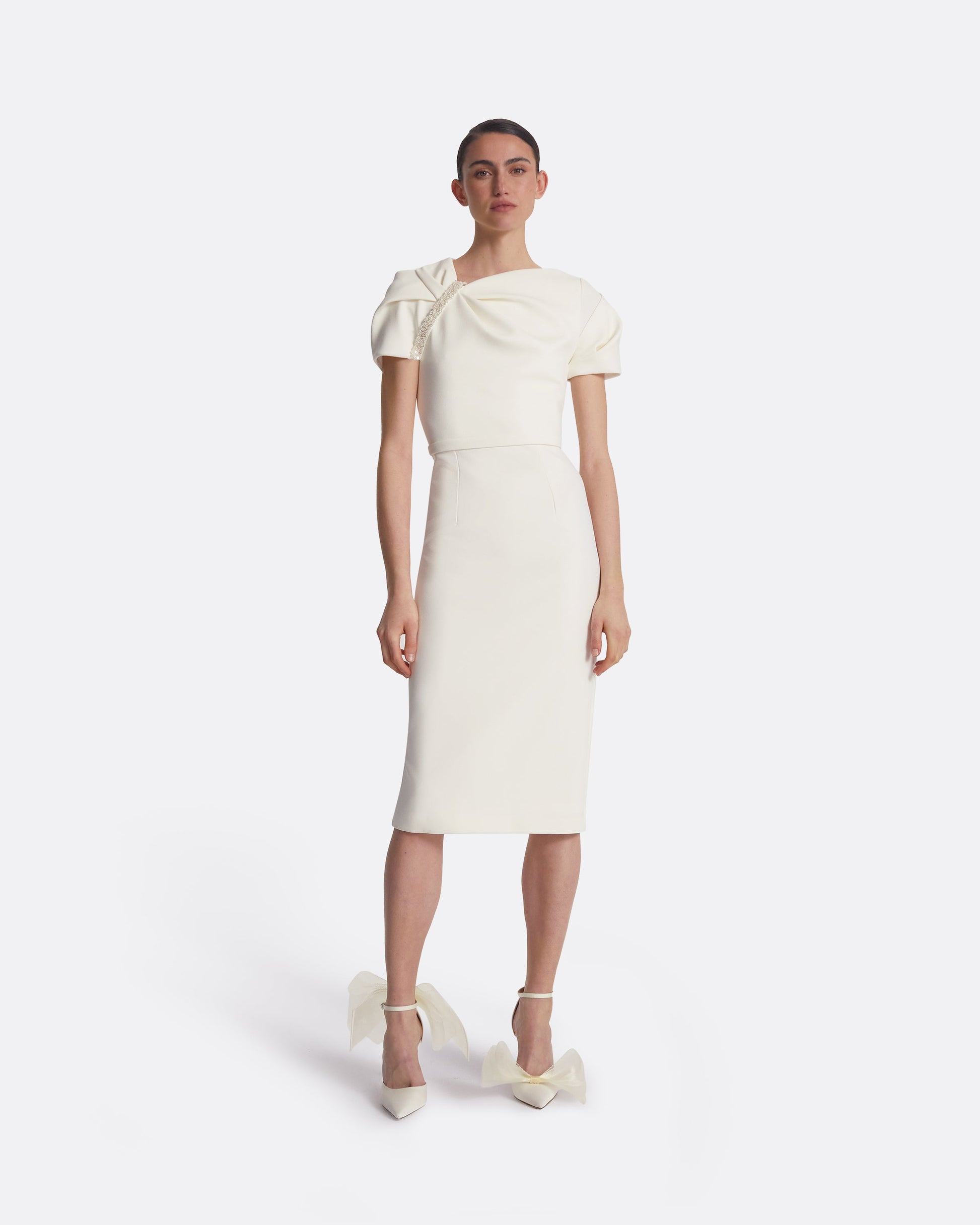 Short sleeved cocktail dress with intricate neckline detail in ivory Heavy Crepe with pearl Blossom embroidery.
