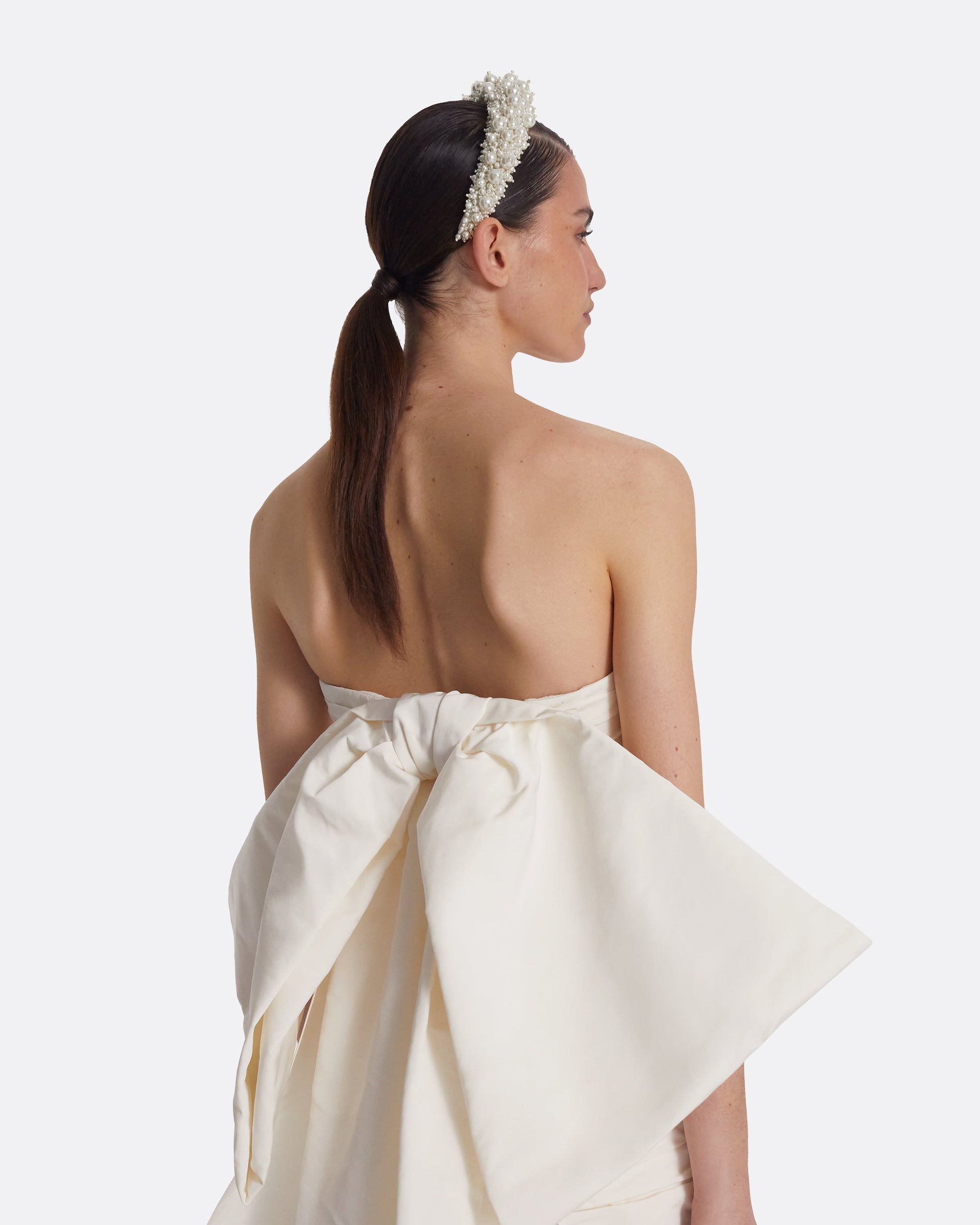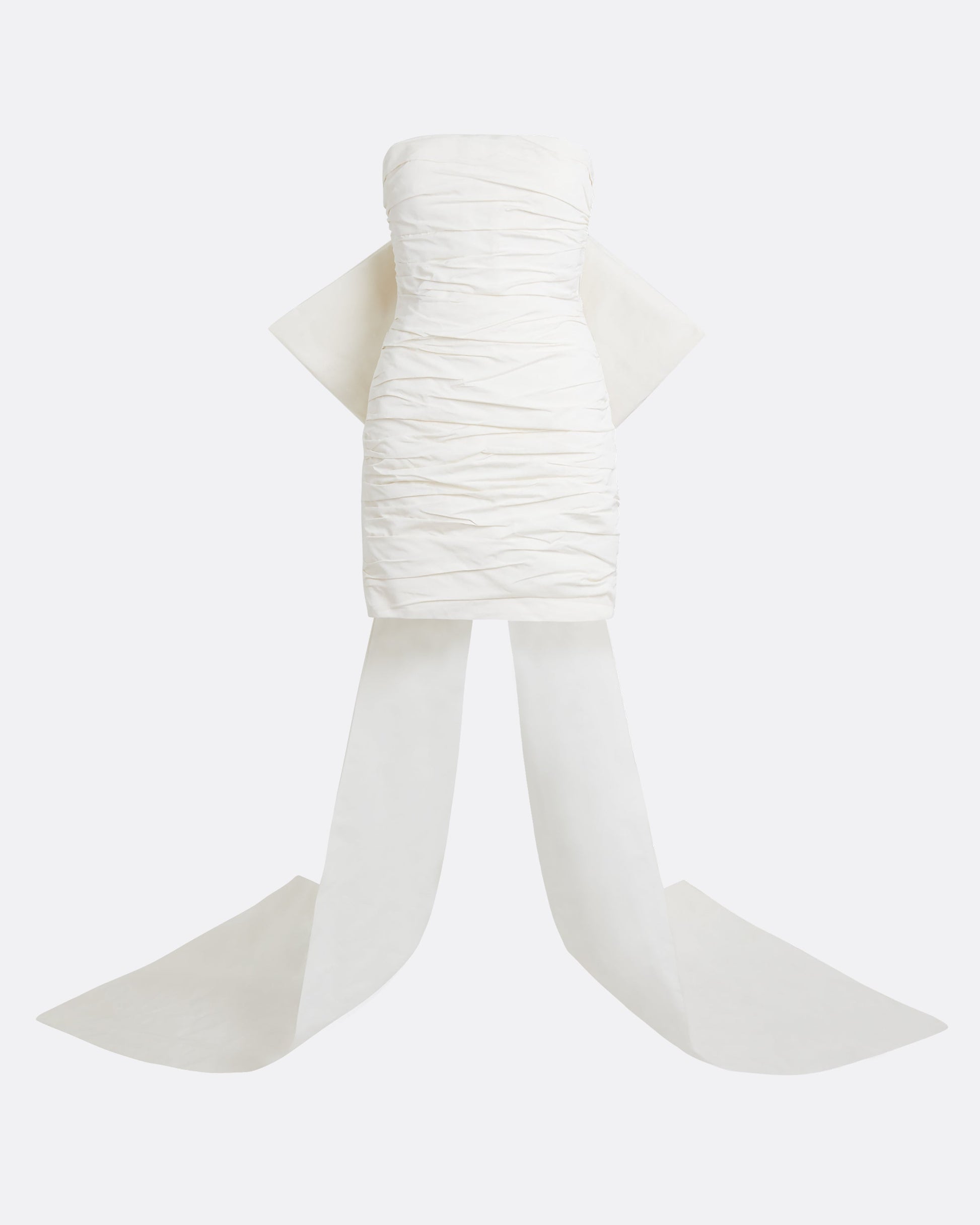Striking mini dress with gathered bodice and dramatic bow drape in ivory Faille,