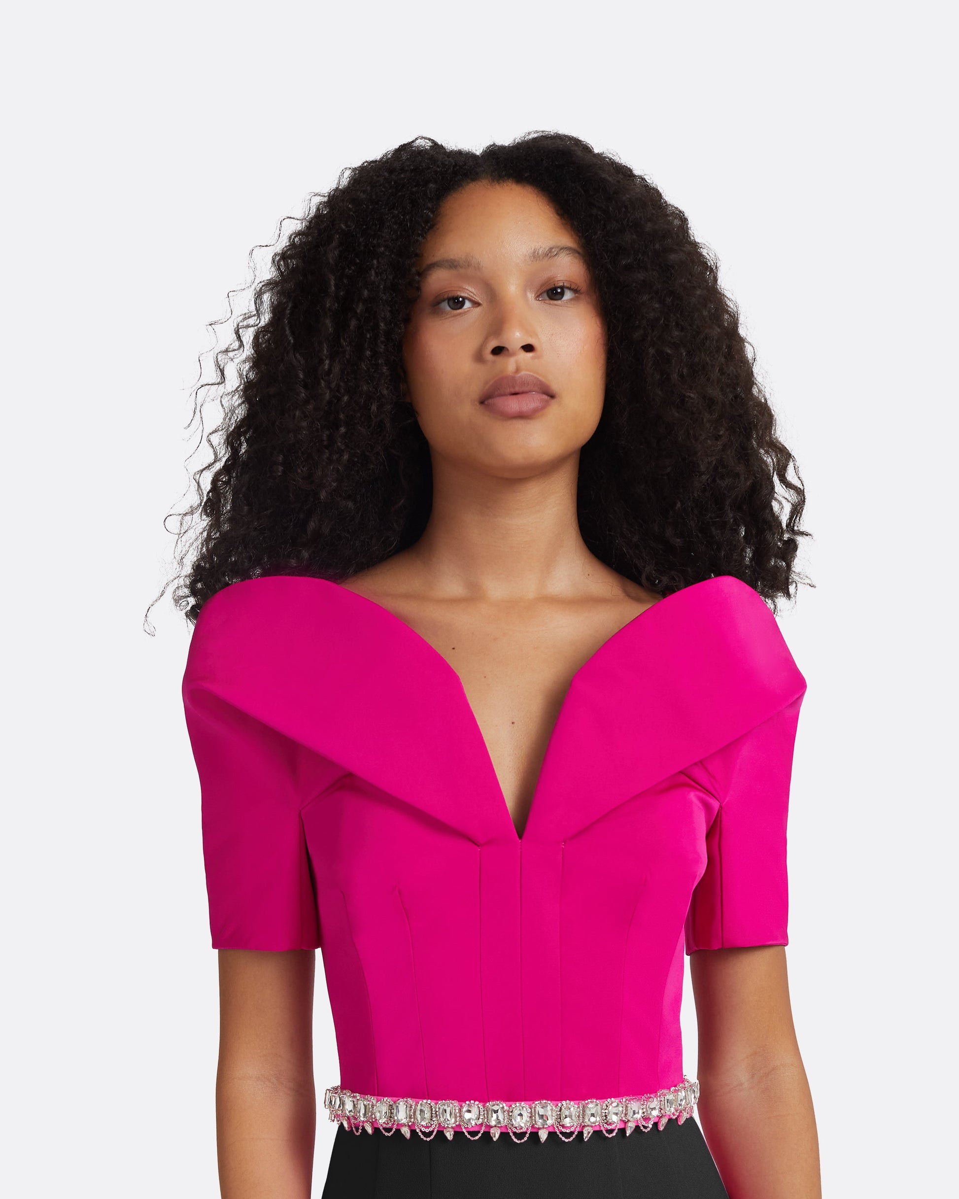 Column gown with contrast bust detail in beverley Faille on black Heavy Crepe with crystal Adorned Trim Chain embroidery.
