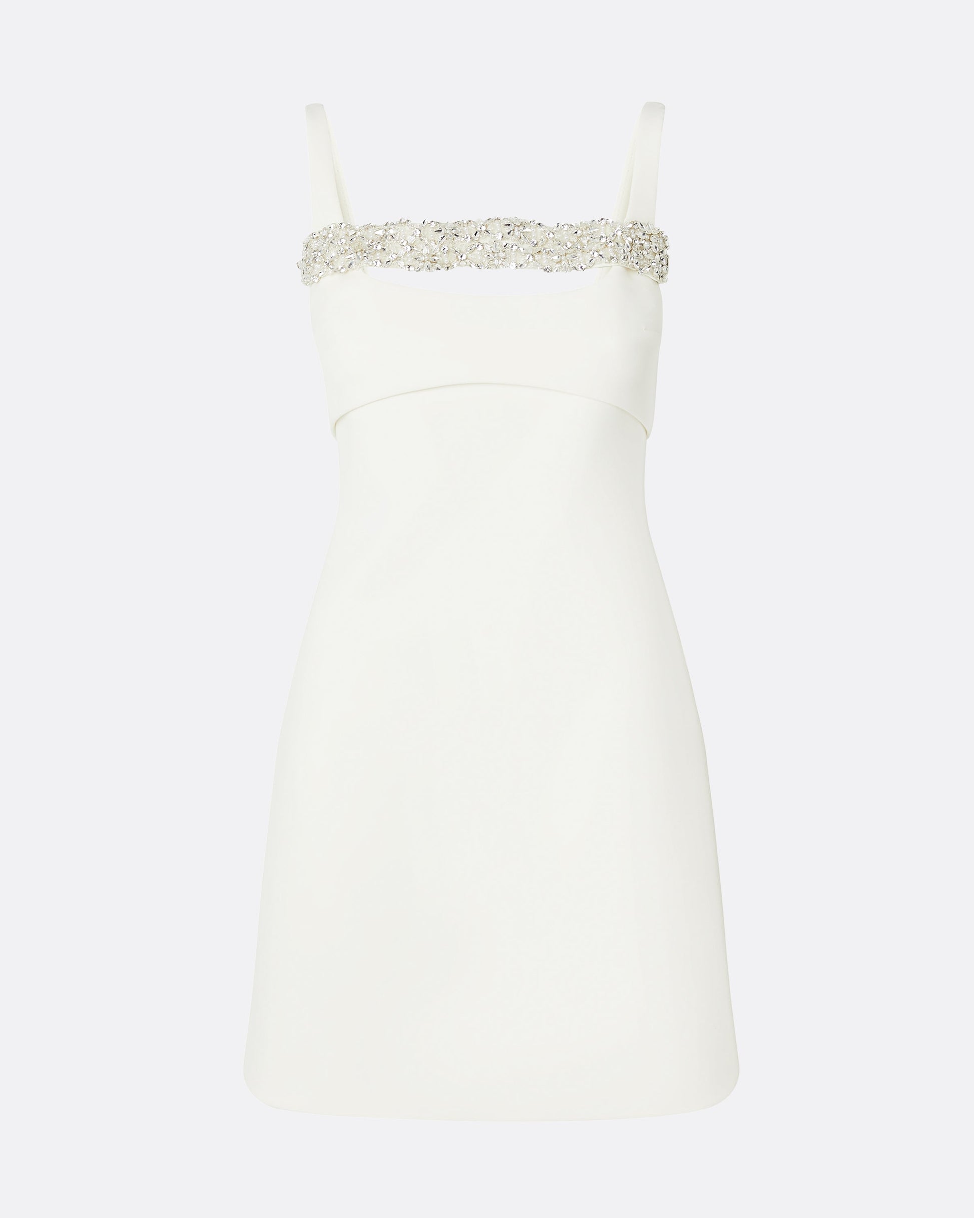 Mini dress with curved neck and embroidery detail in ivory Heavy Crepe and Folius Trim embroidery.
