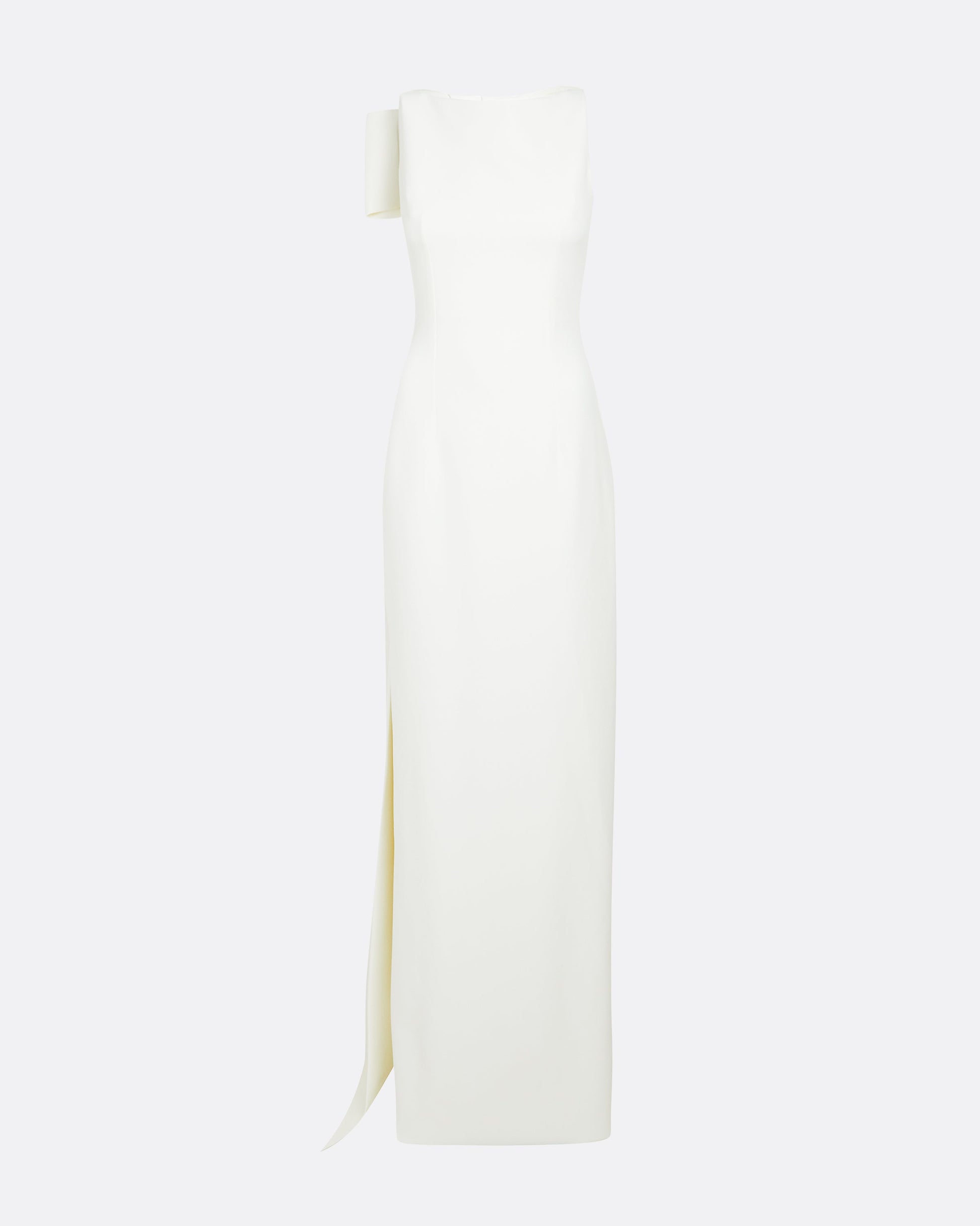 Full-length dress in ivory heavy crepe with a boat neckline, folded drape at the reverse and long tail strap. Item fully lined.