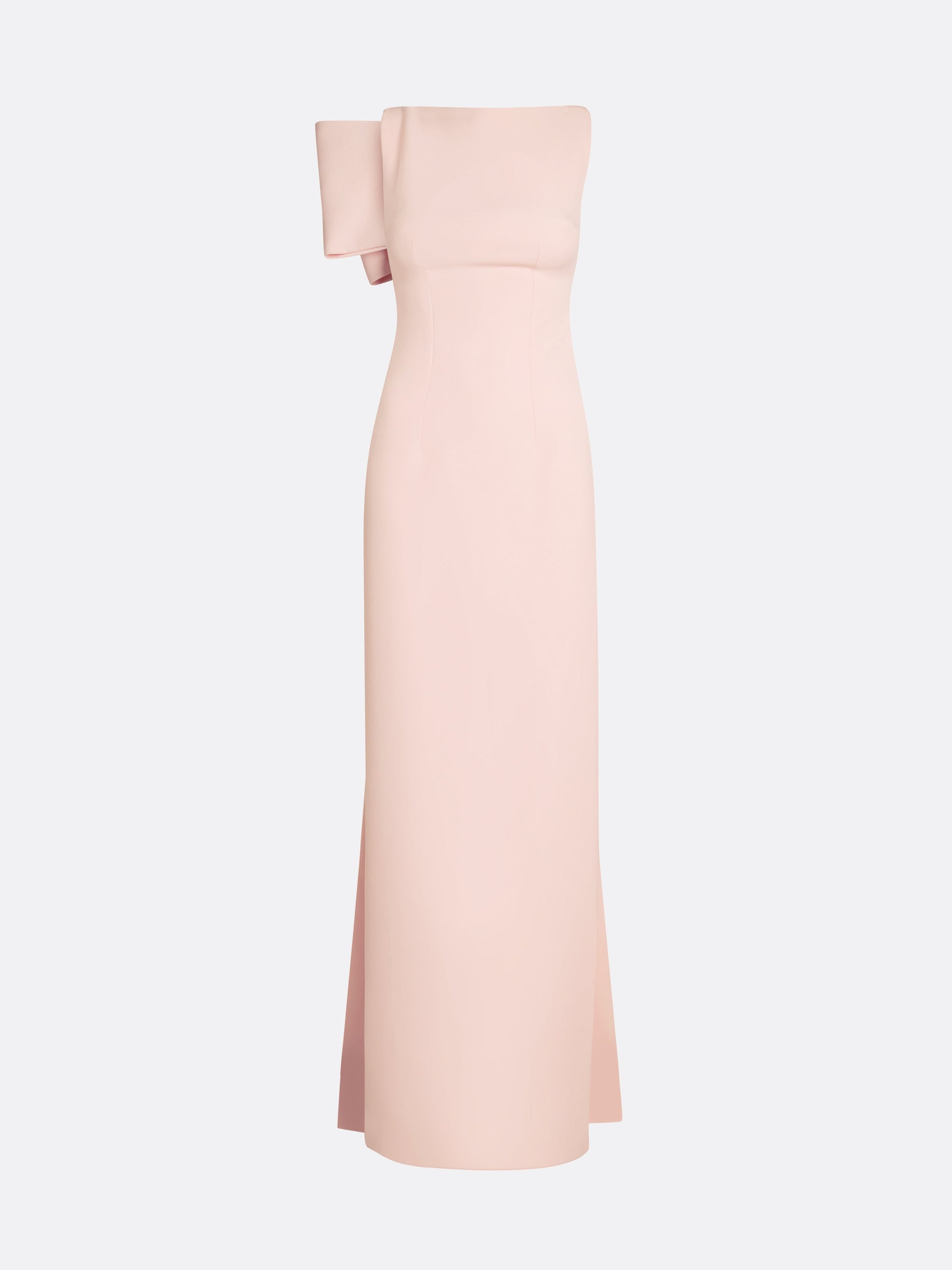 Full-length dress in pale pink heavy crepe with a boat neckline, folded drape at the reverse and long tail strap.