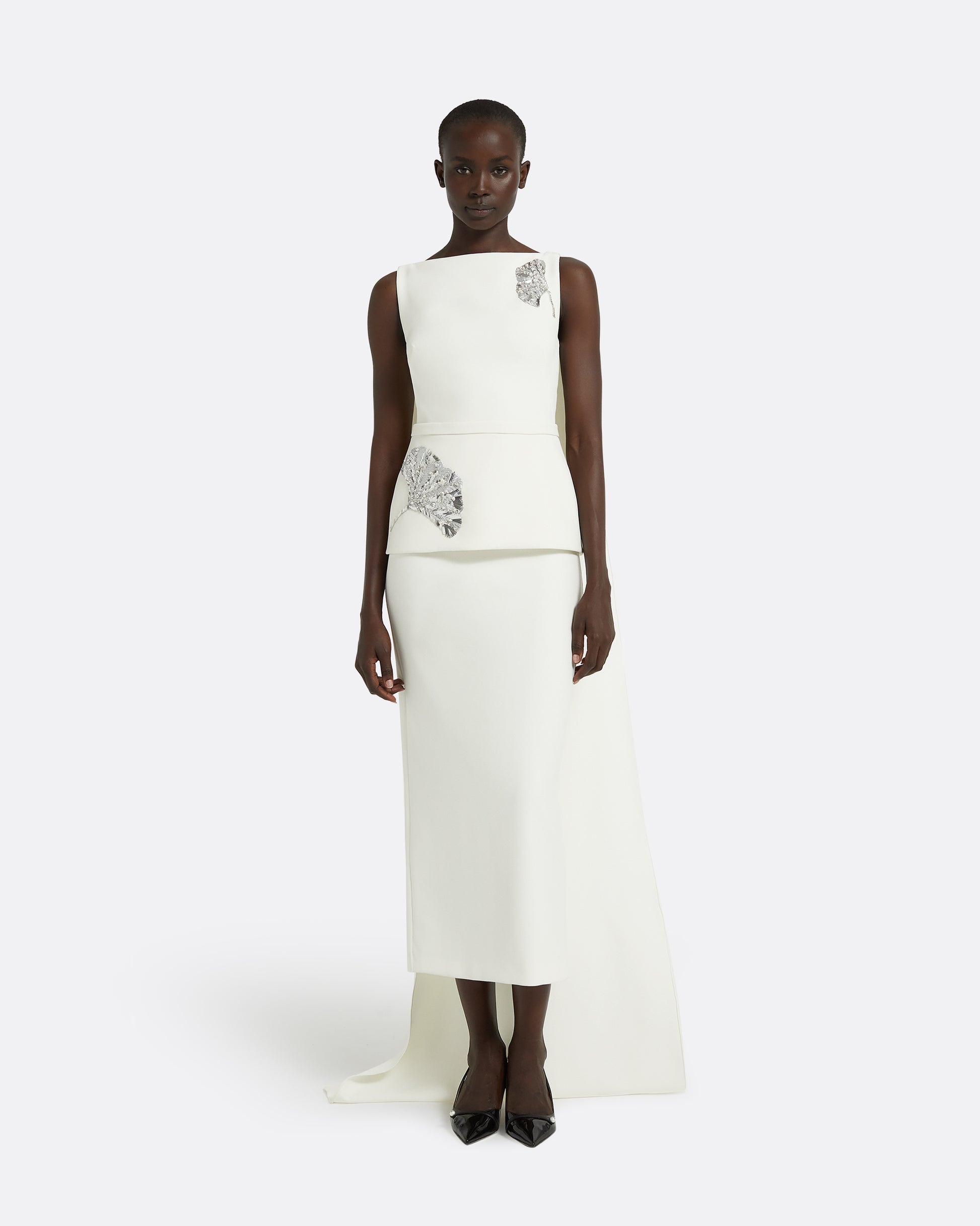 High boatneck cocktail dress with long cape in ivory Heavy Crepe with silver Metallic Leaf embroidery.