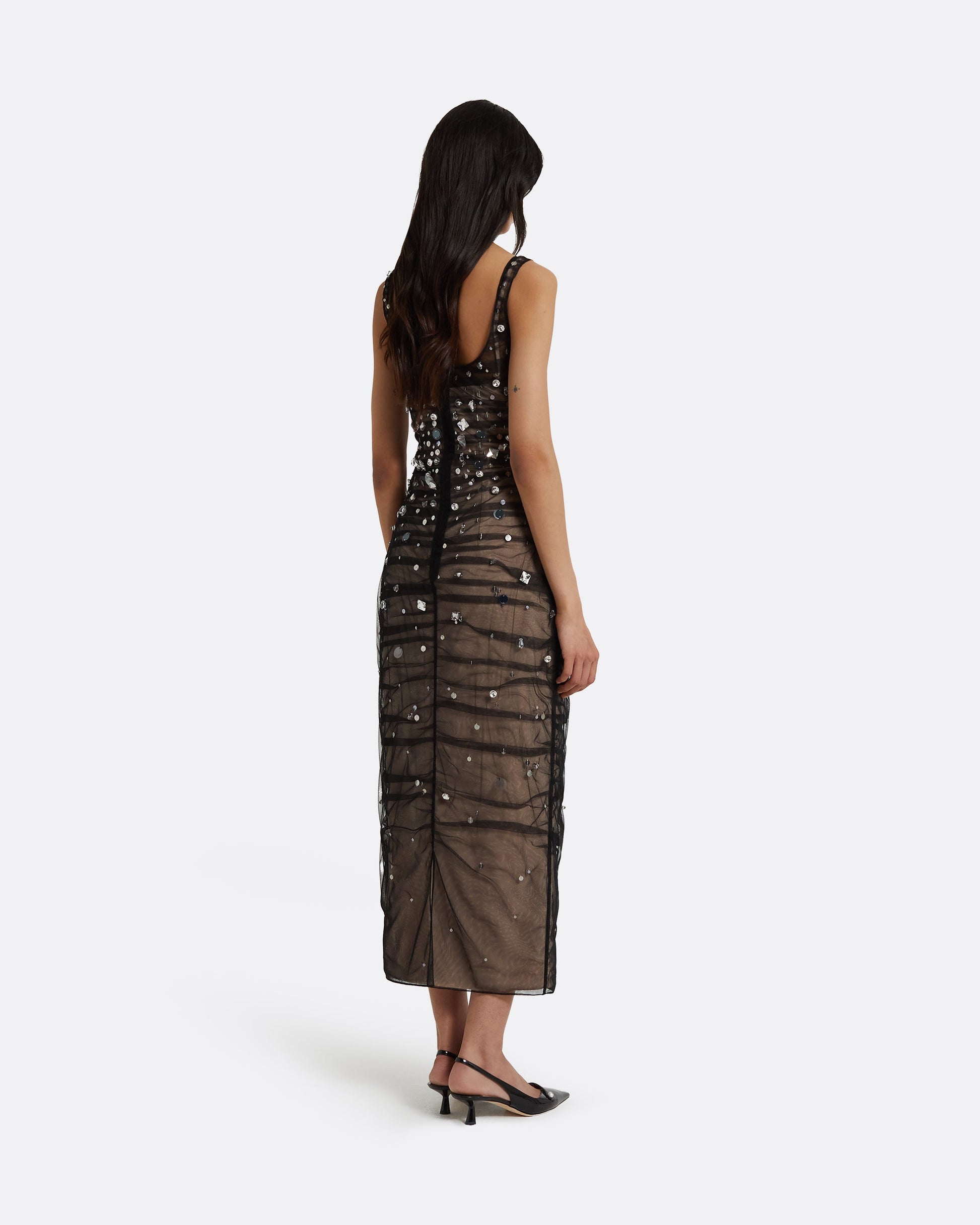 Mid-calf, layered dress with pleat details in black Light Tulle with crystal Elisabetta embroidery.