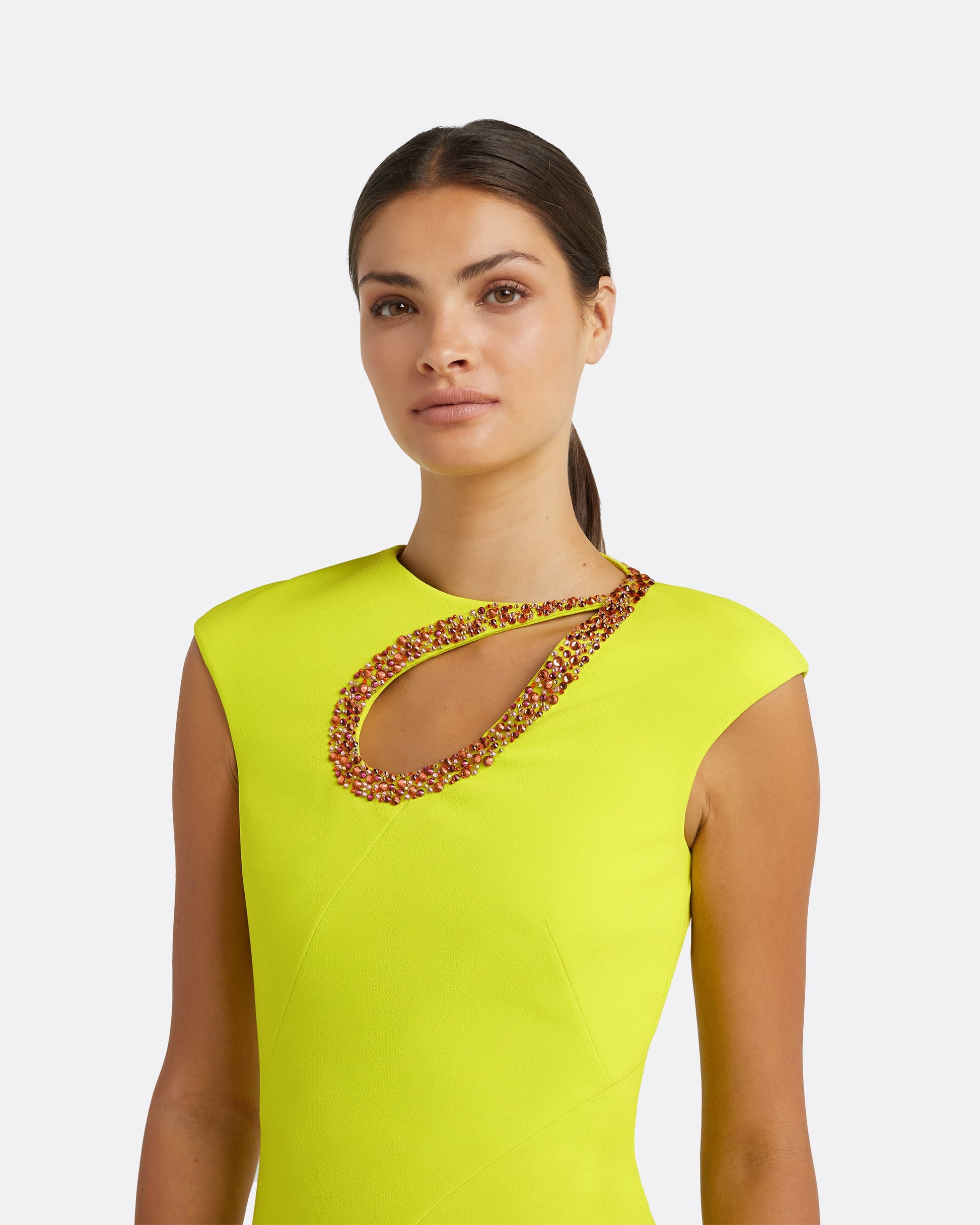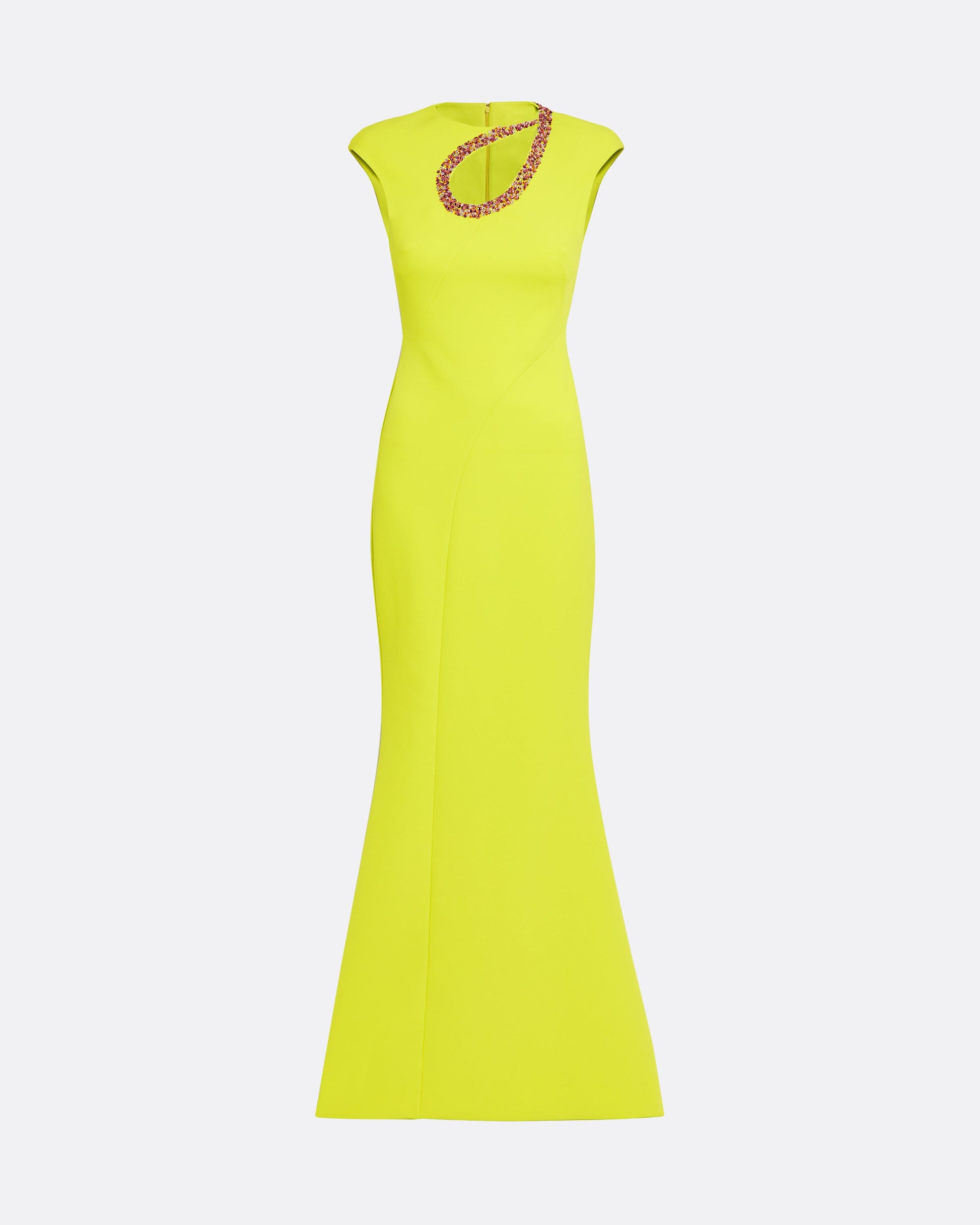Cap sleeved gown with fishtail skirt, tear drop cut out and spiral seam line in meknes Heavy Crepe with multi-grenada Pop Scatter embroidery.