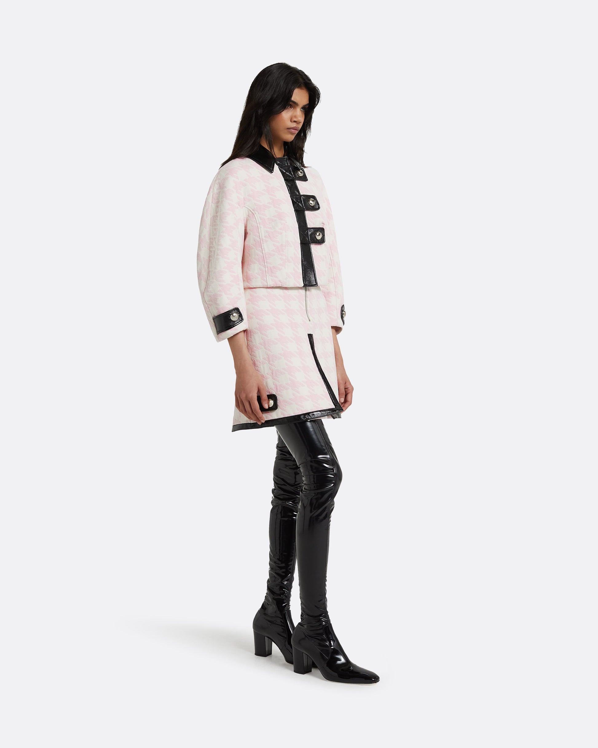A-line mini skirt with leather and zip detail in black High Shine PU on barely pink Houndstooth.