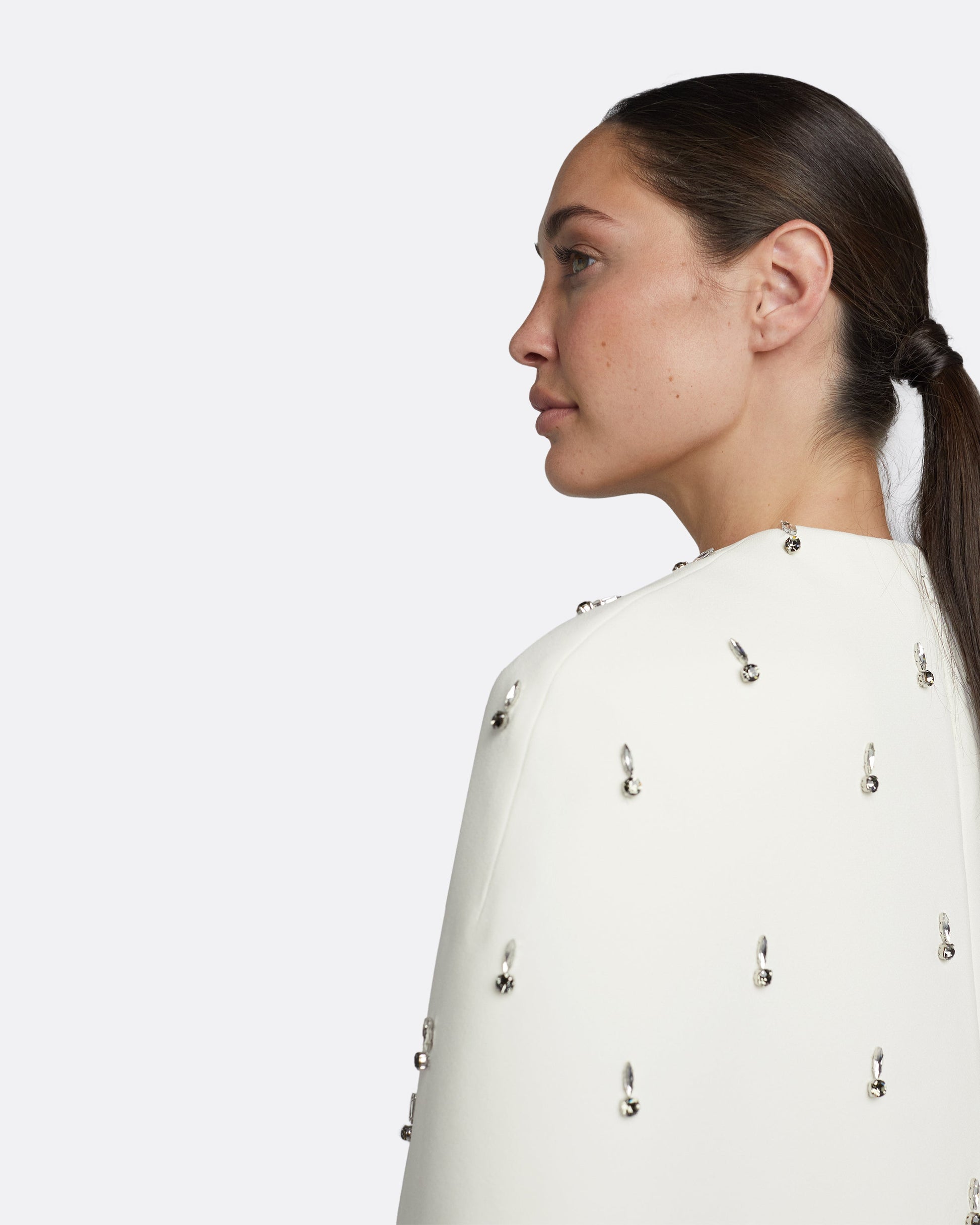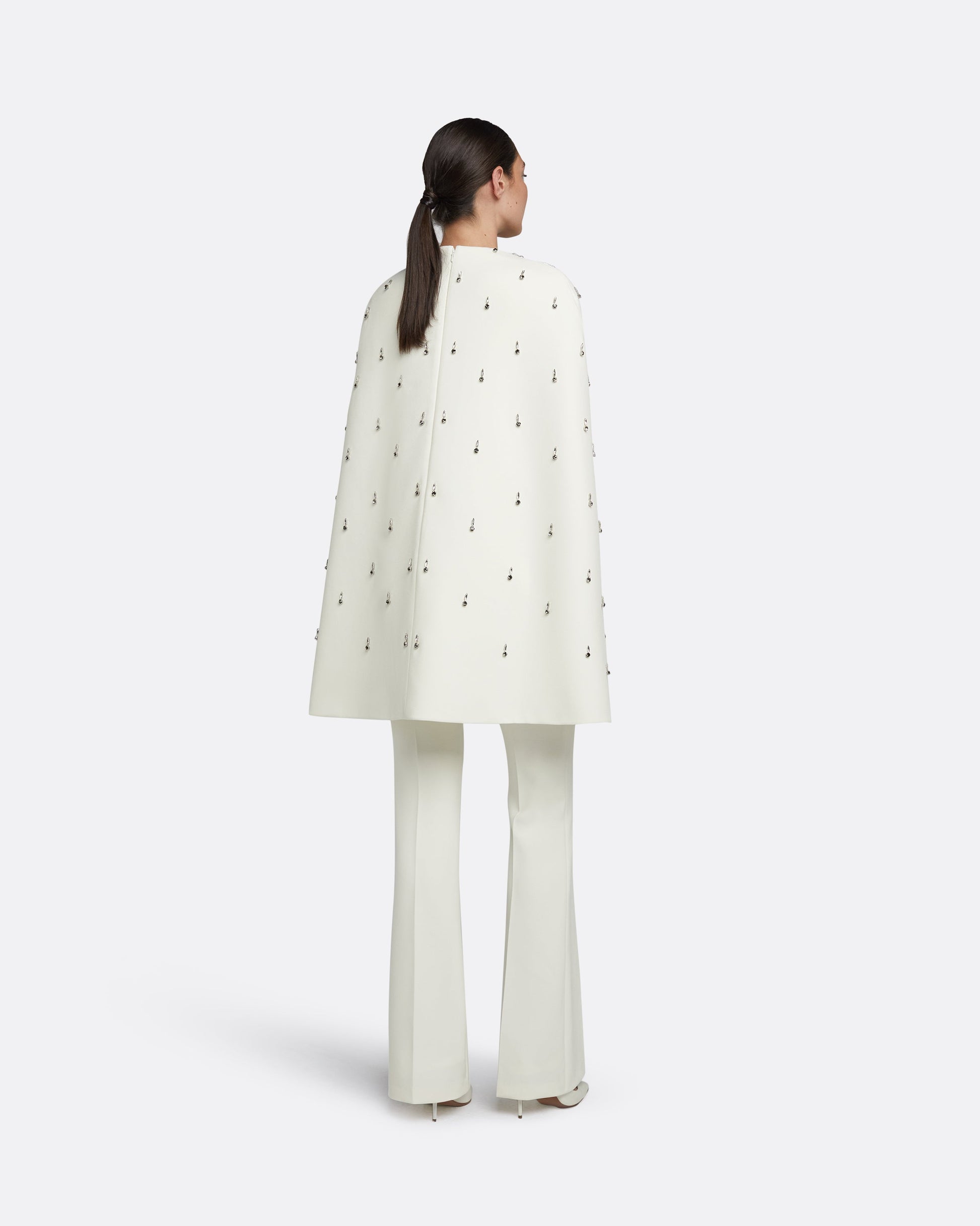 Straight neck jumpsuit with caped back and semi sleeve in ivory Heavy Crepe with smoke/crystal Crystal Grid embroidery.