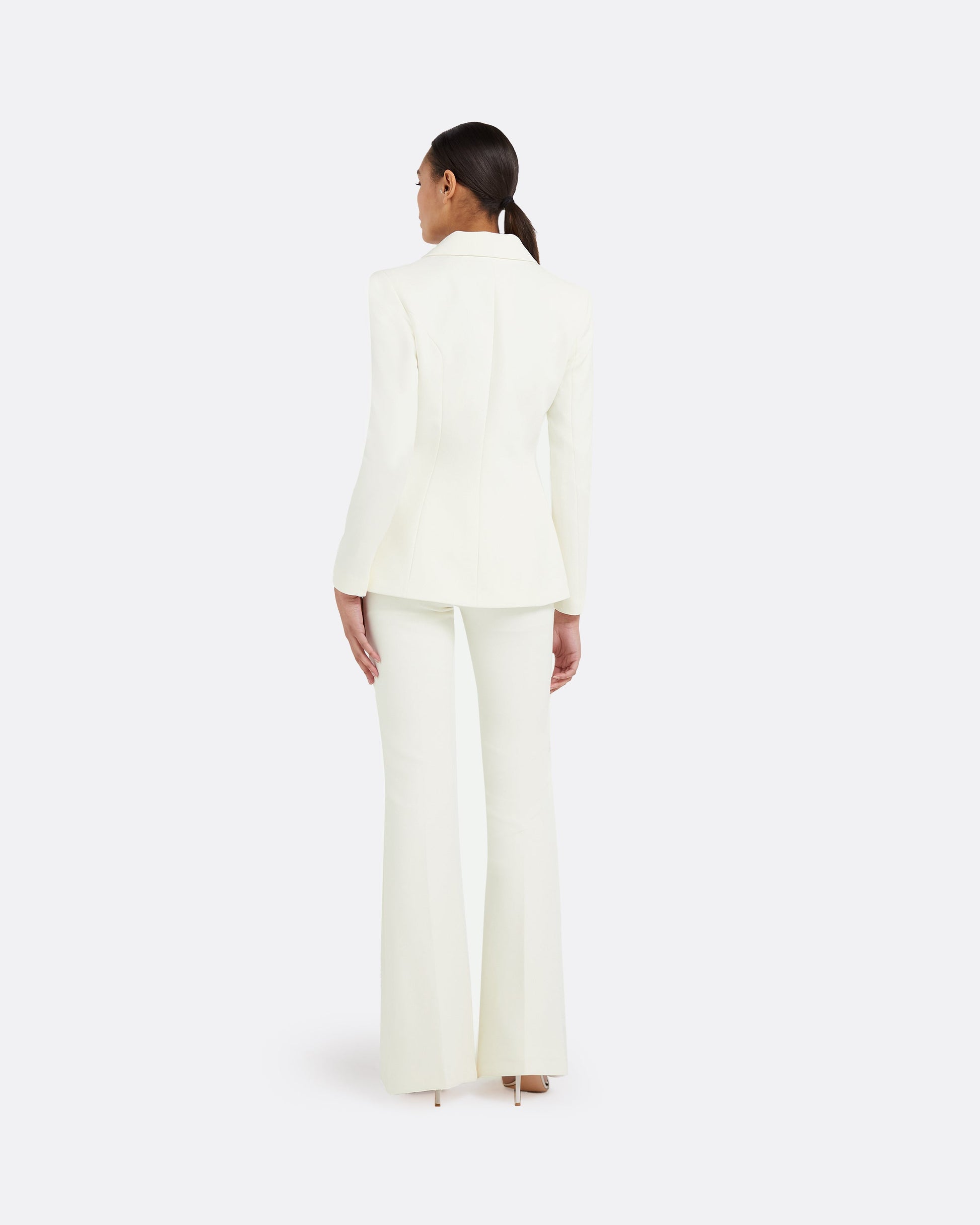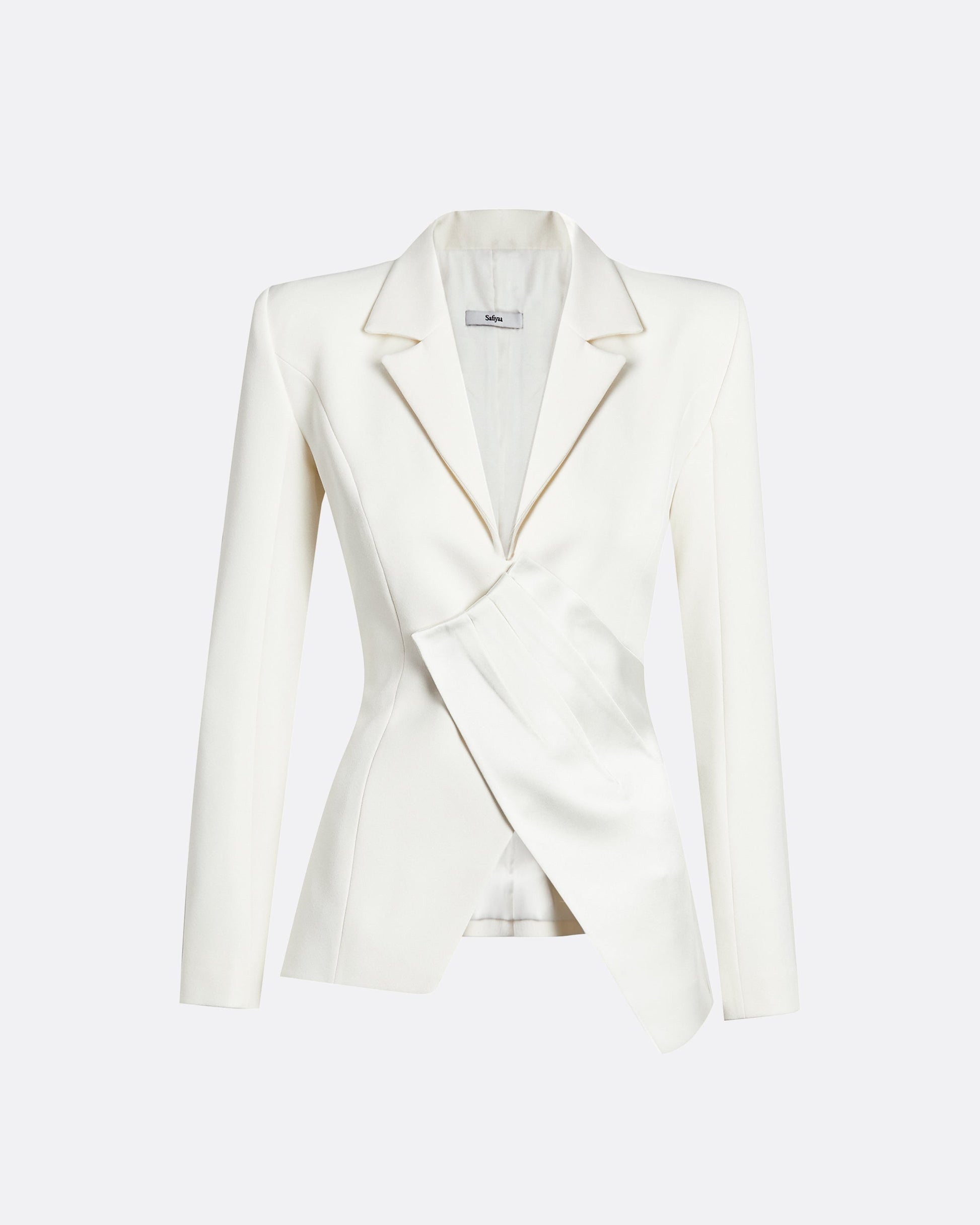 Tuxedo jacket with lapel and single curved pleated peplum detail in ivory heavy Crepe and Shine Satin Stretch.