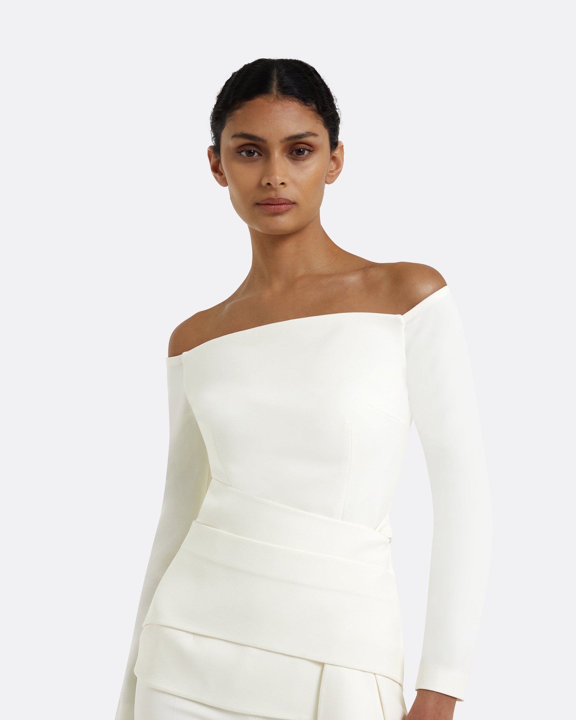 Off the shoulder long sleeve top with looping floor length sash in ivory.