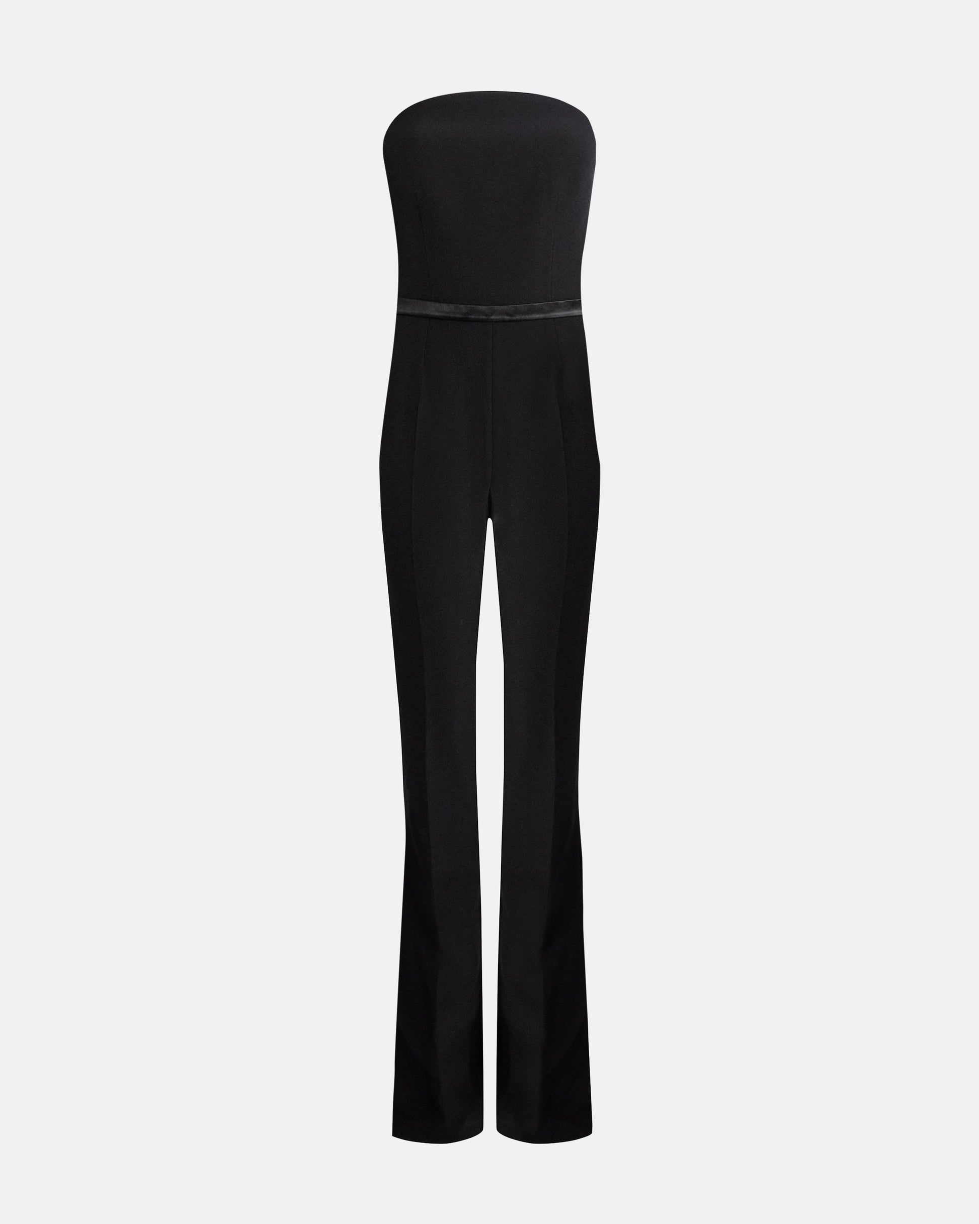 Strapless jumpsuit with semi flared pants and 2cm Duchess belt in black. Belt included.