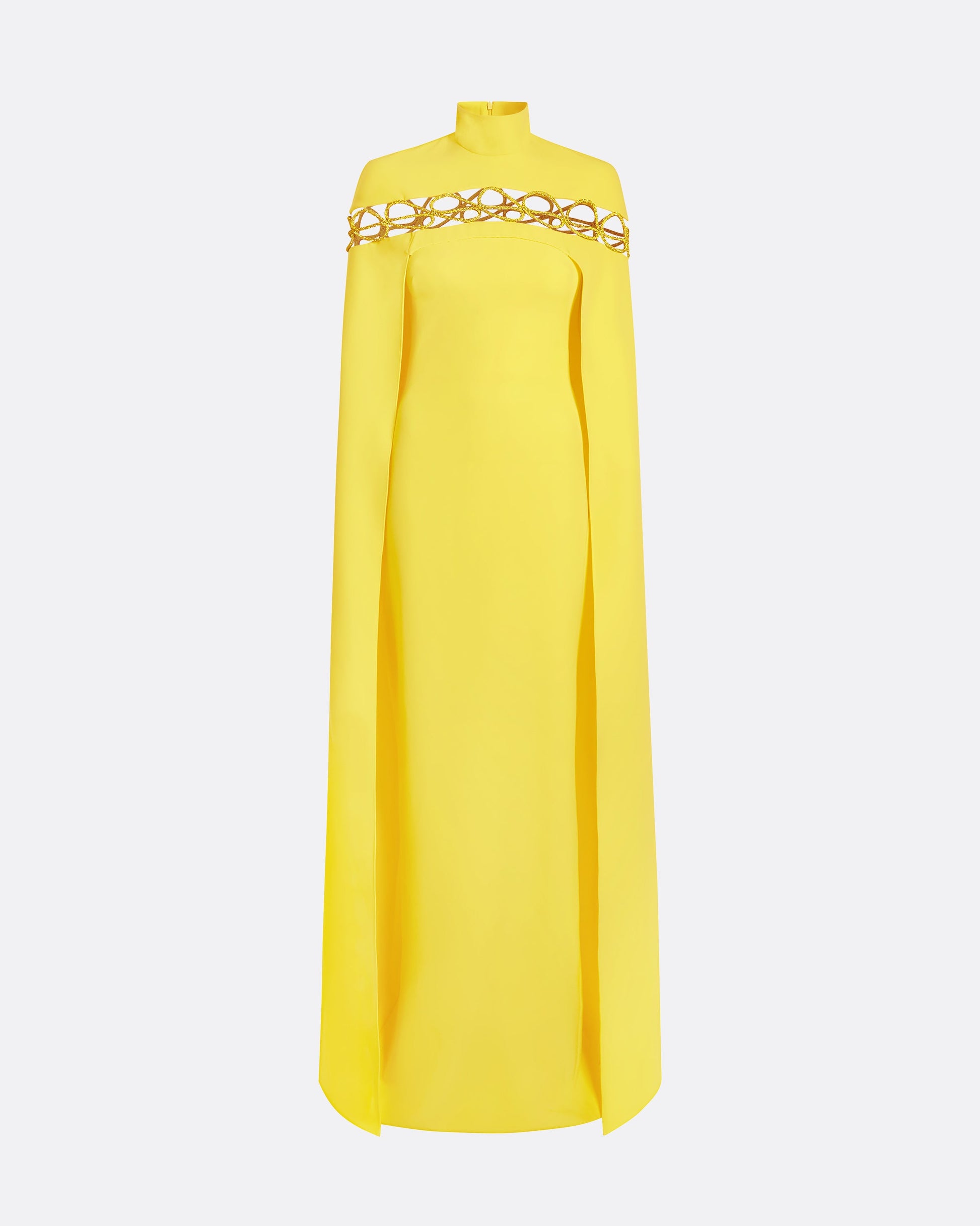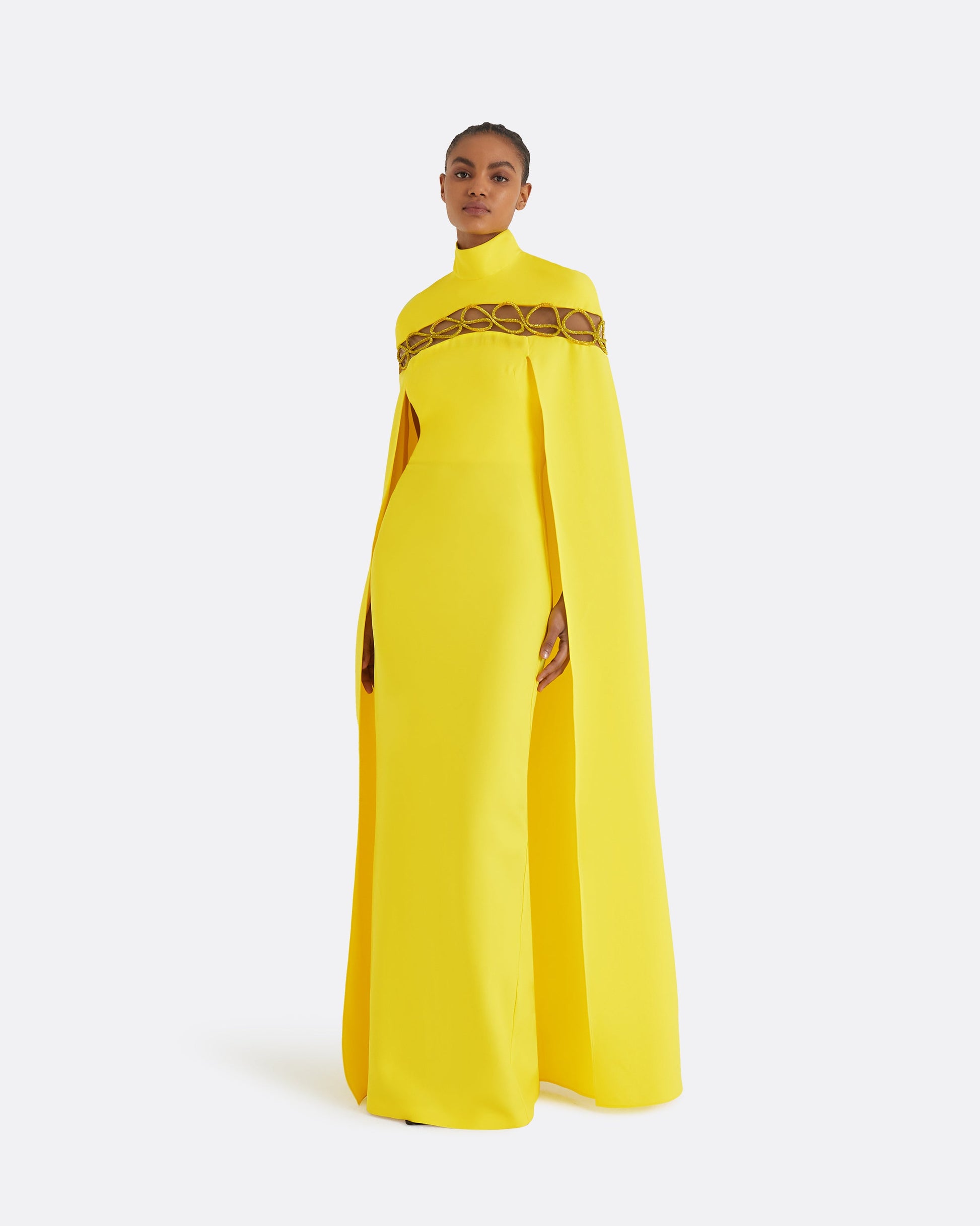 Floor length, caped gown with column skirt and high neck in buttercup Heavy Crepe and Citrine Crystal Cord.