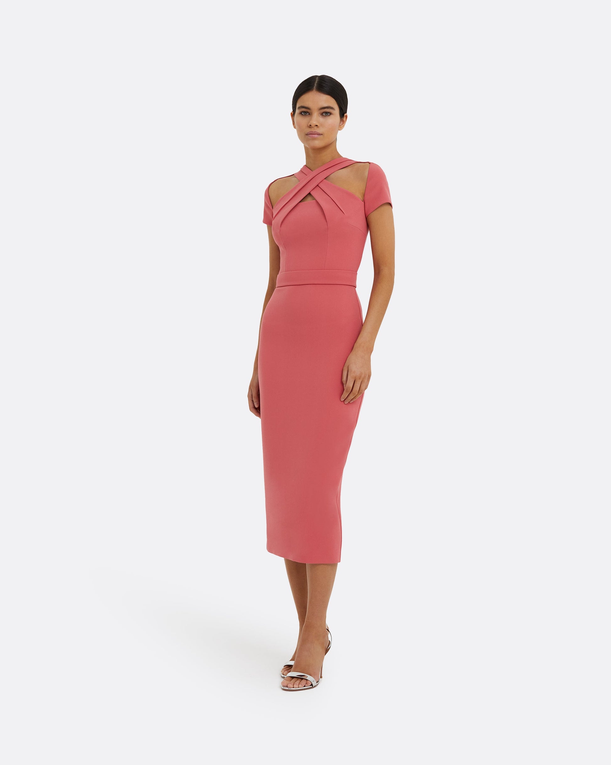 Draped halter neck cocktail dress with cap sleeves in terracotta.