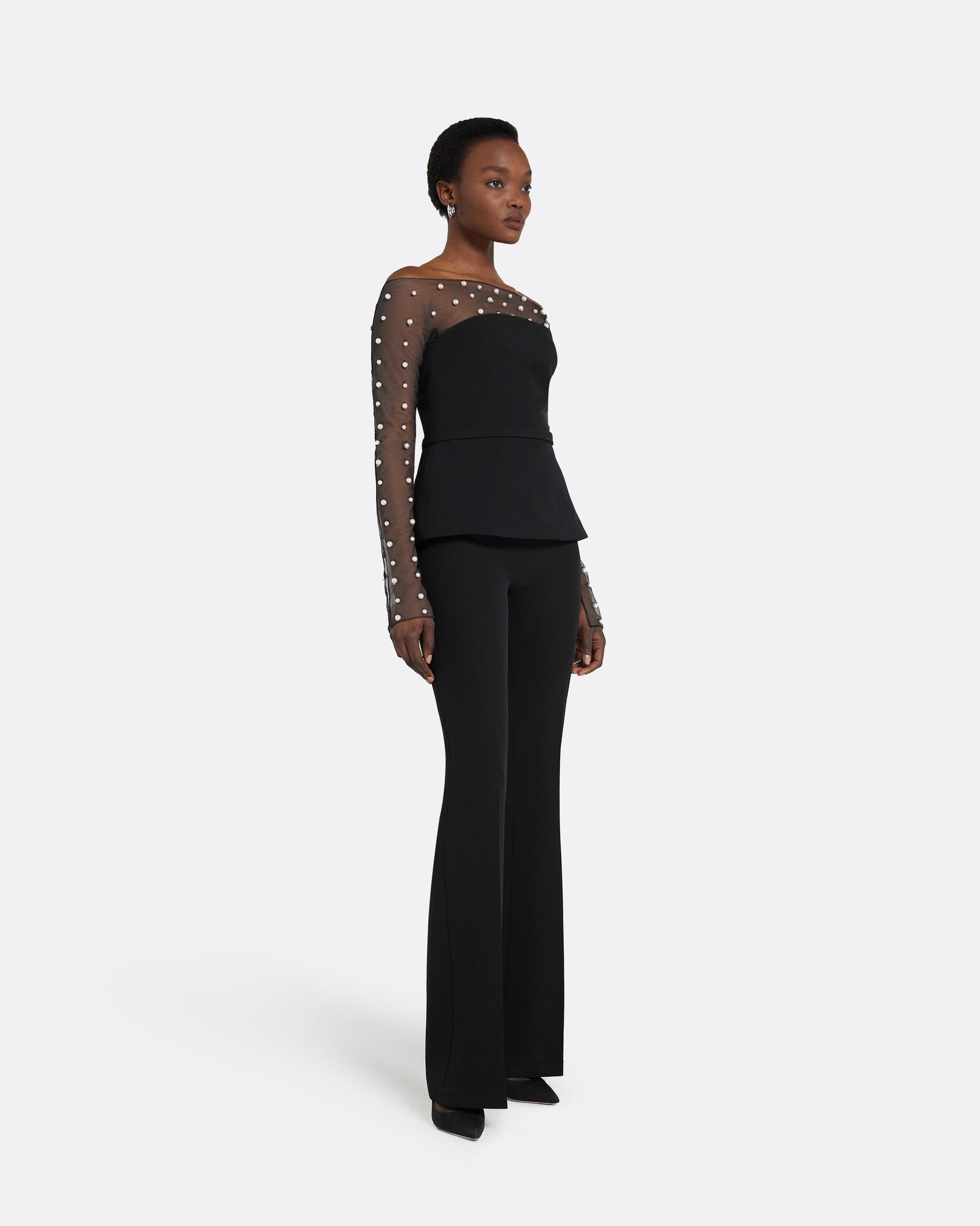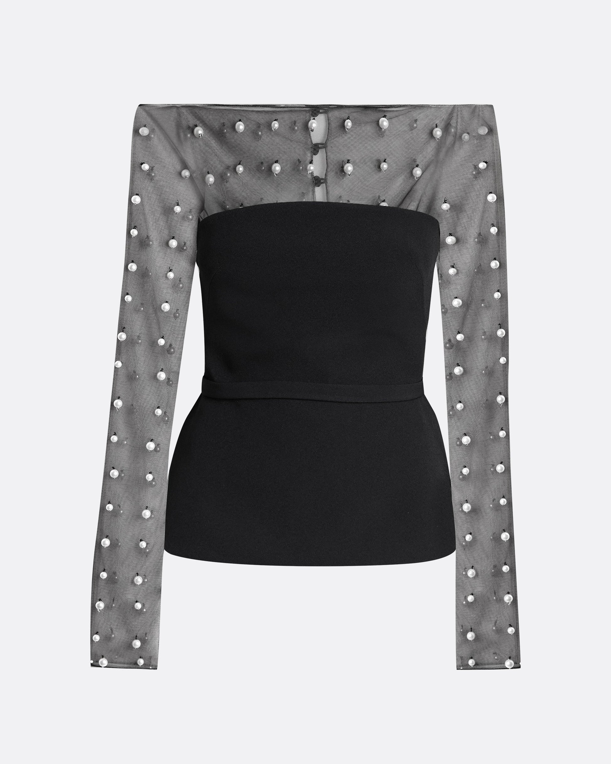 Black bustier top with off the shoulder, Pearl Drop embroidered underlay in black Tulle.