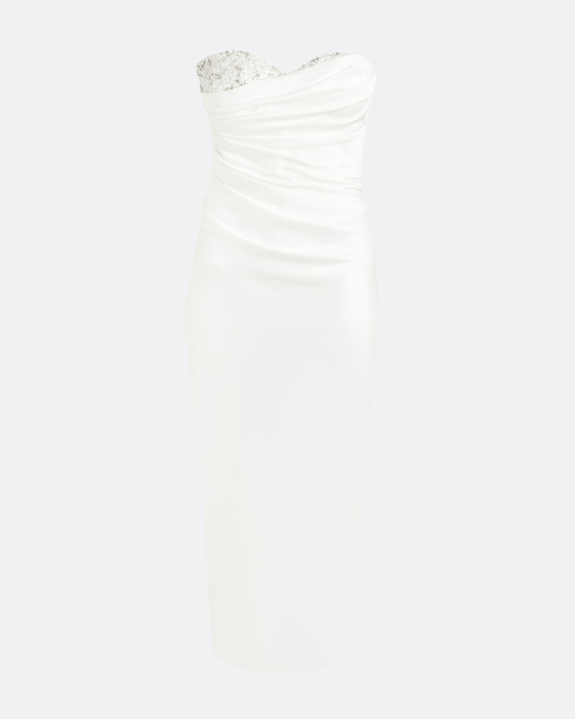 Strapless knee length dress featuring heavily beaded neckline and a-symmetric bust pleats in ivory with Cluster Drops embroidery.