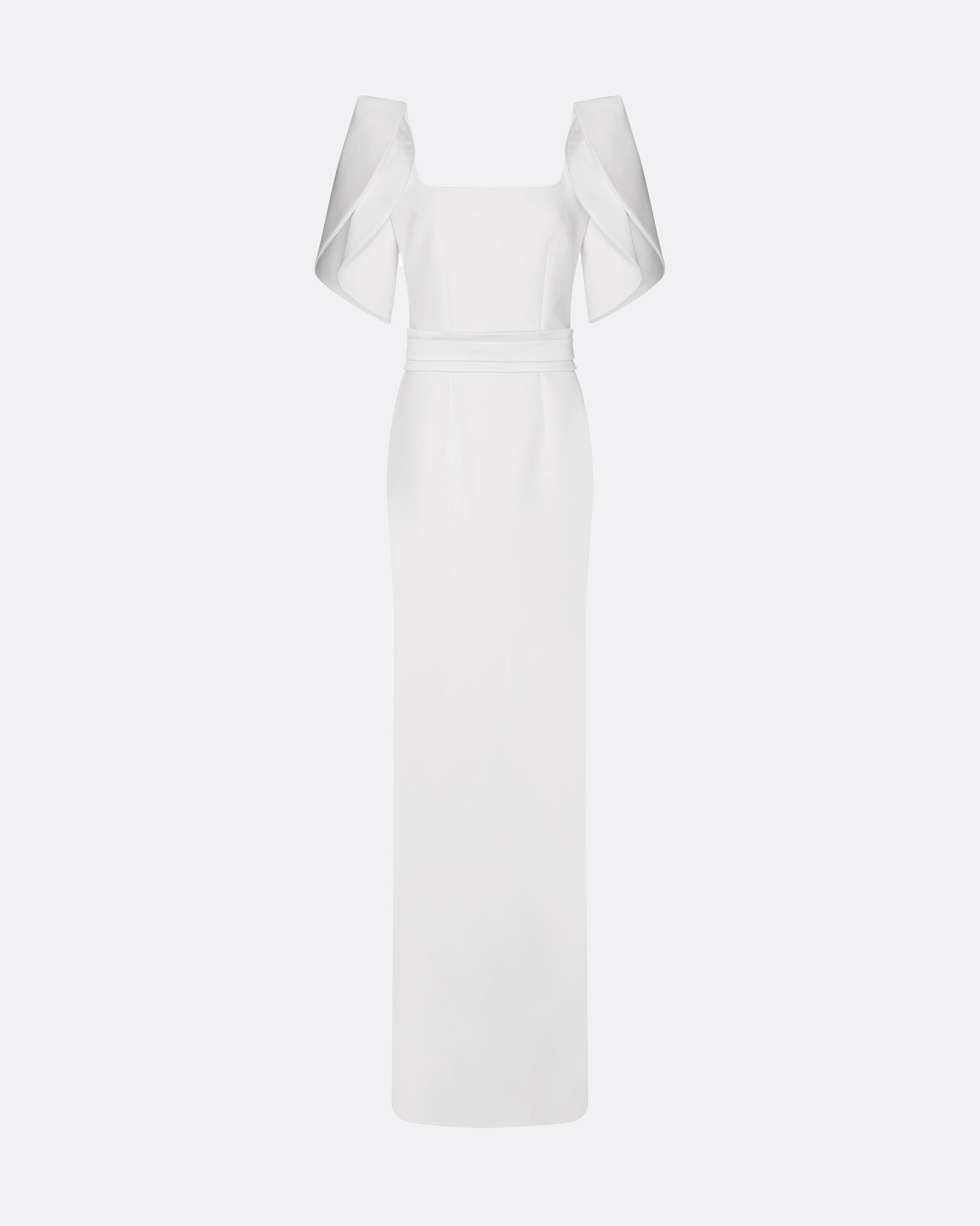 Square neck long dress in ivory heavy crepe, with ivory shine satin stretch lotus sleeve drape.