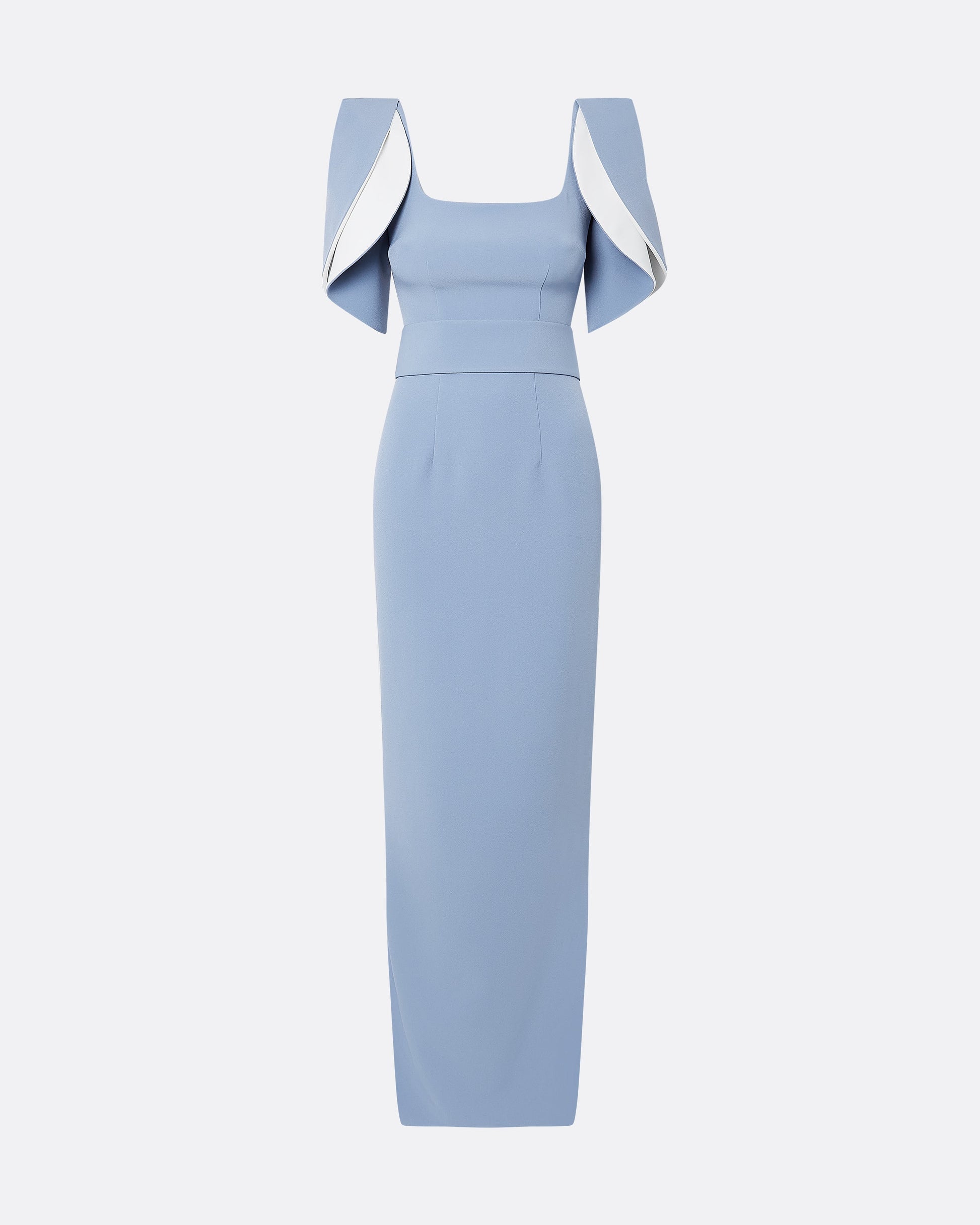 Square neck long dress with lotus sleeve drape in ivory on blue ash Heavy Crepe.