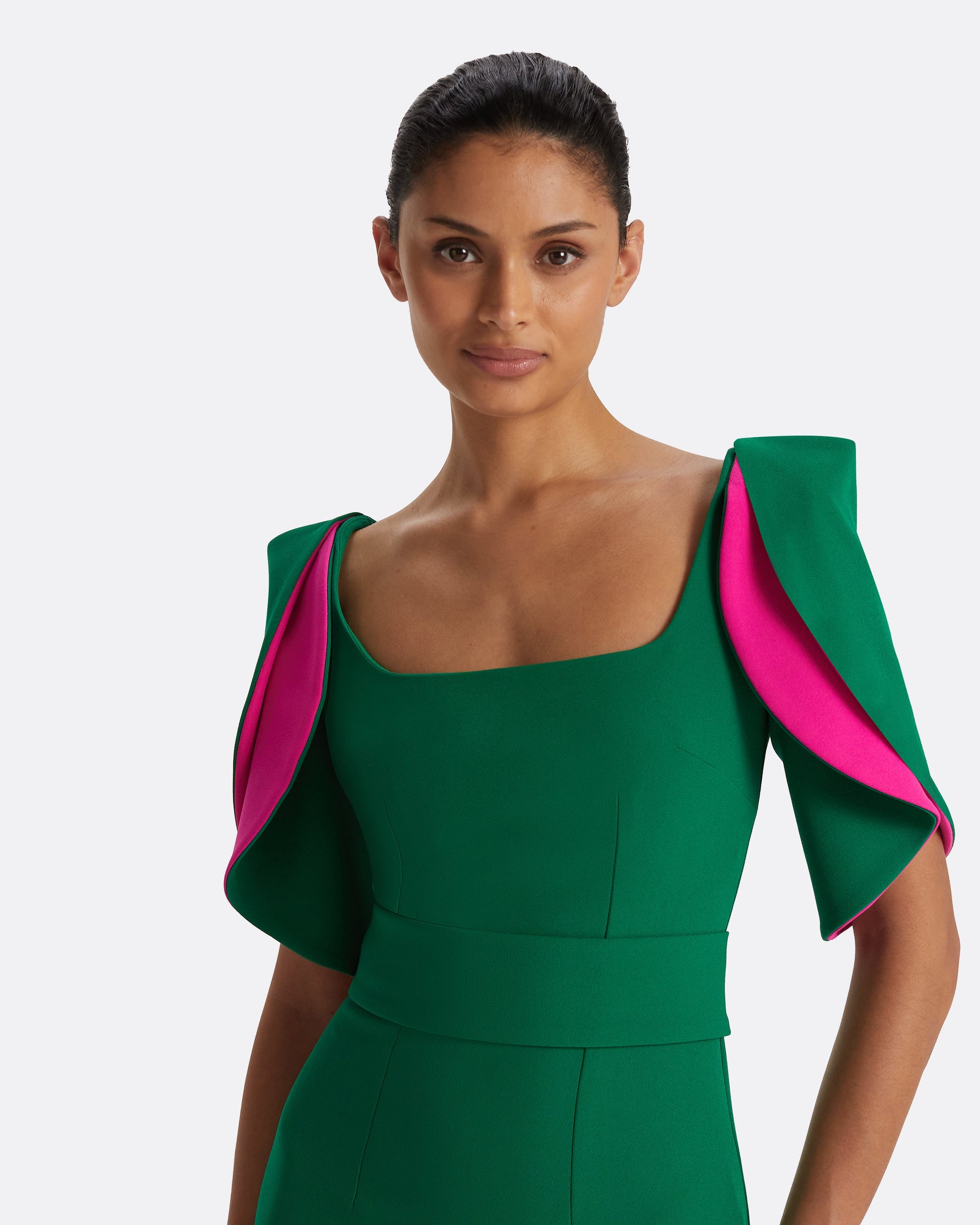 Square neck long dress with lotus sleeve drape in wild strawberry on jewel green Heavy Crepe.