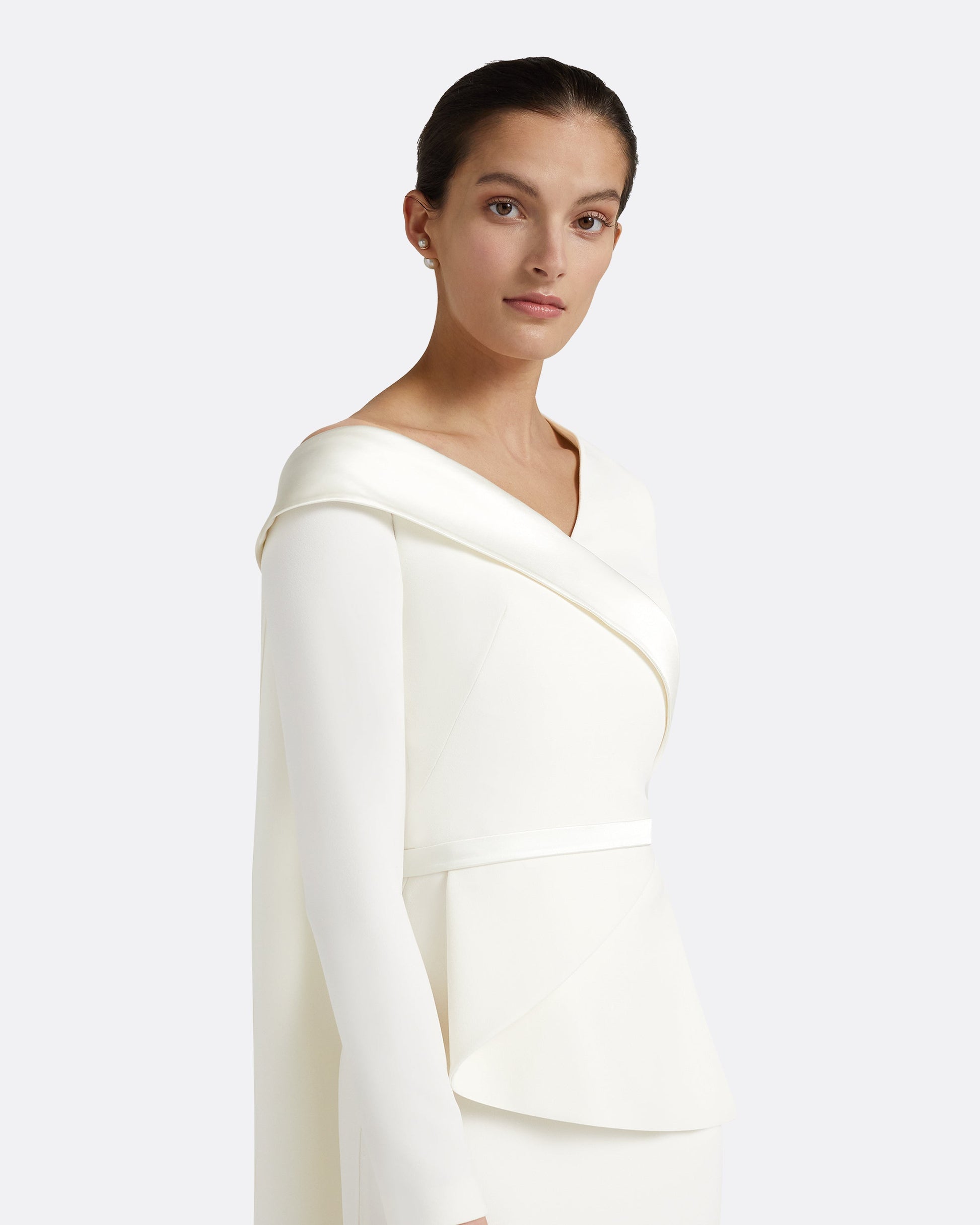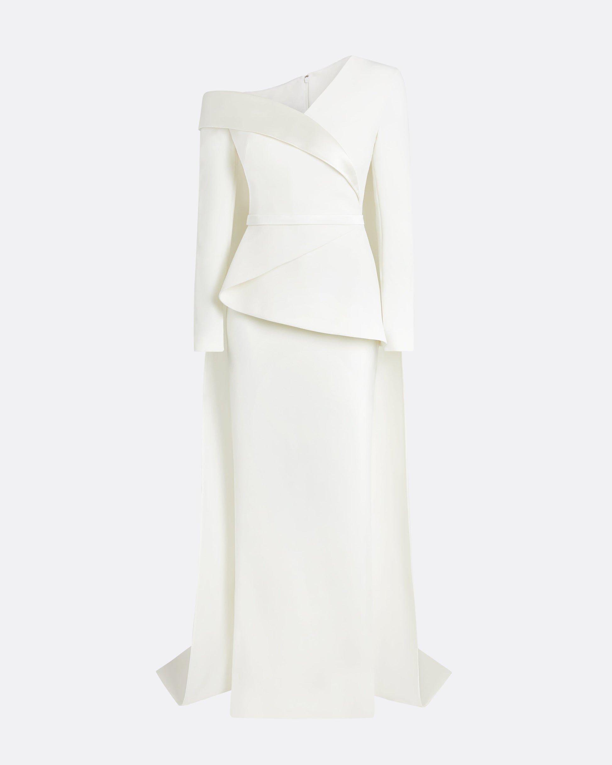 Floor length, caped gown with draped peplum and contrast detail in ivory Heavy Crepe and Silk Duchess.
