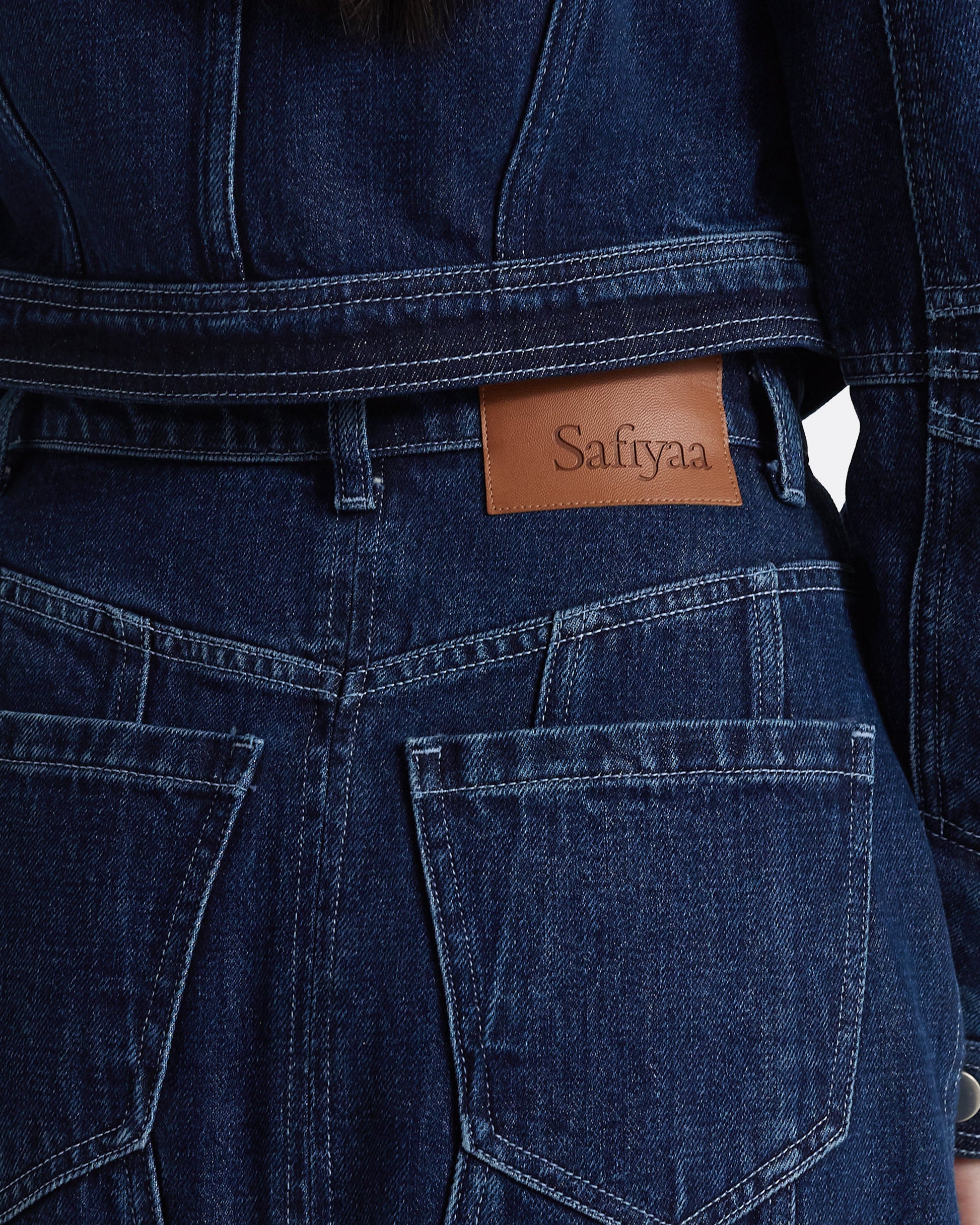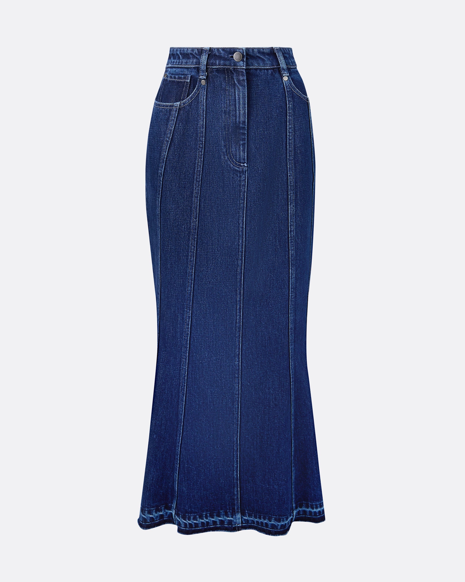 Long skirt with seam detailing in mid wash Indigo Denim.