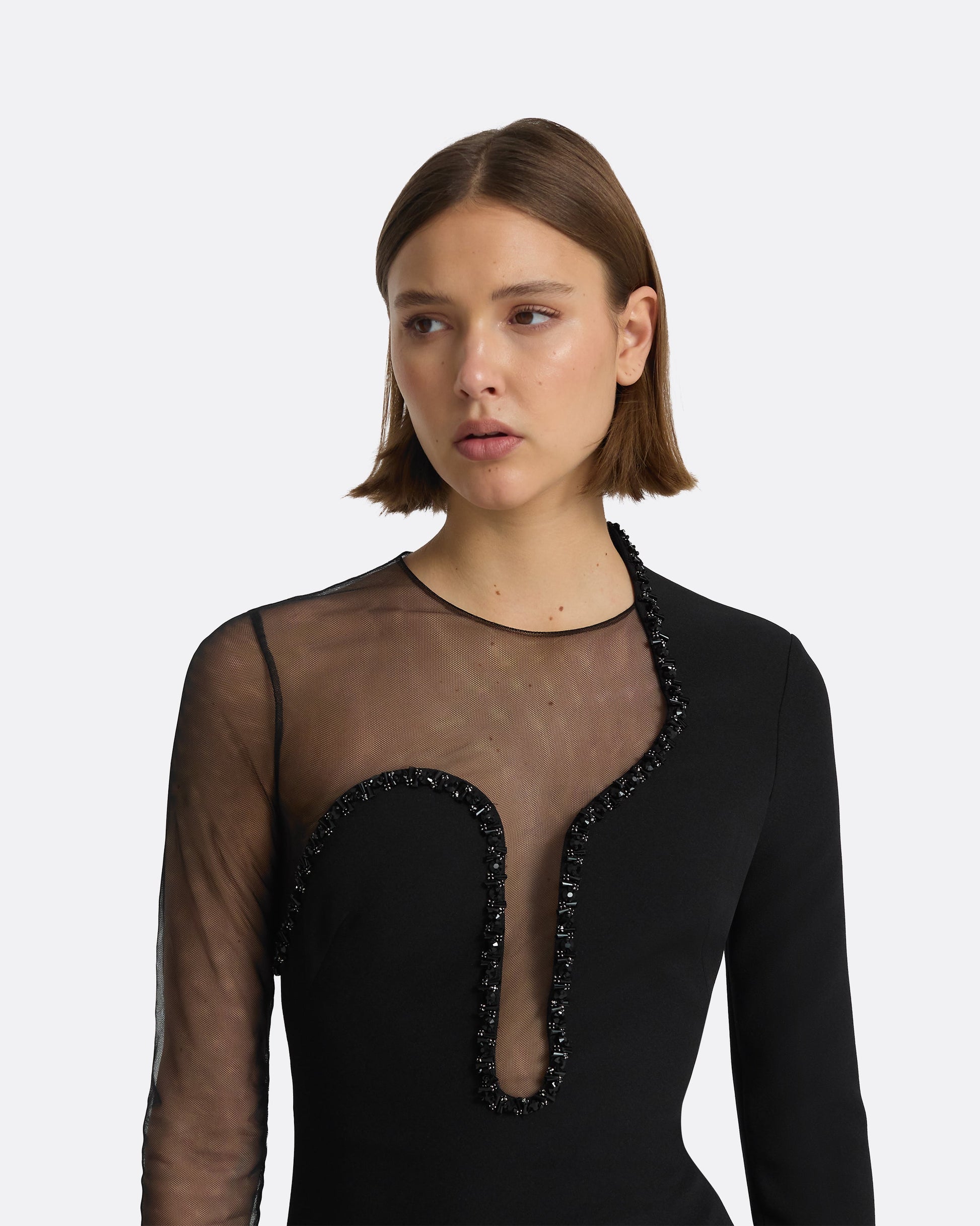 Floor length gown with column skirt, architectural neckline and asymmetric sleeve detail in black Heavy Crepe and Tulle, with black Nuit Trim embroidery.