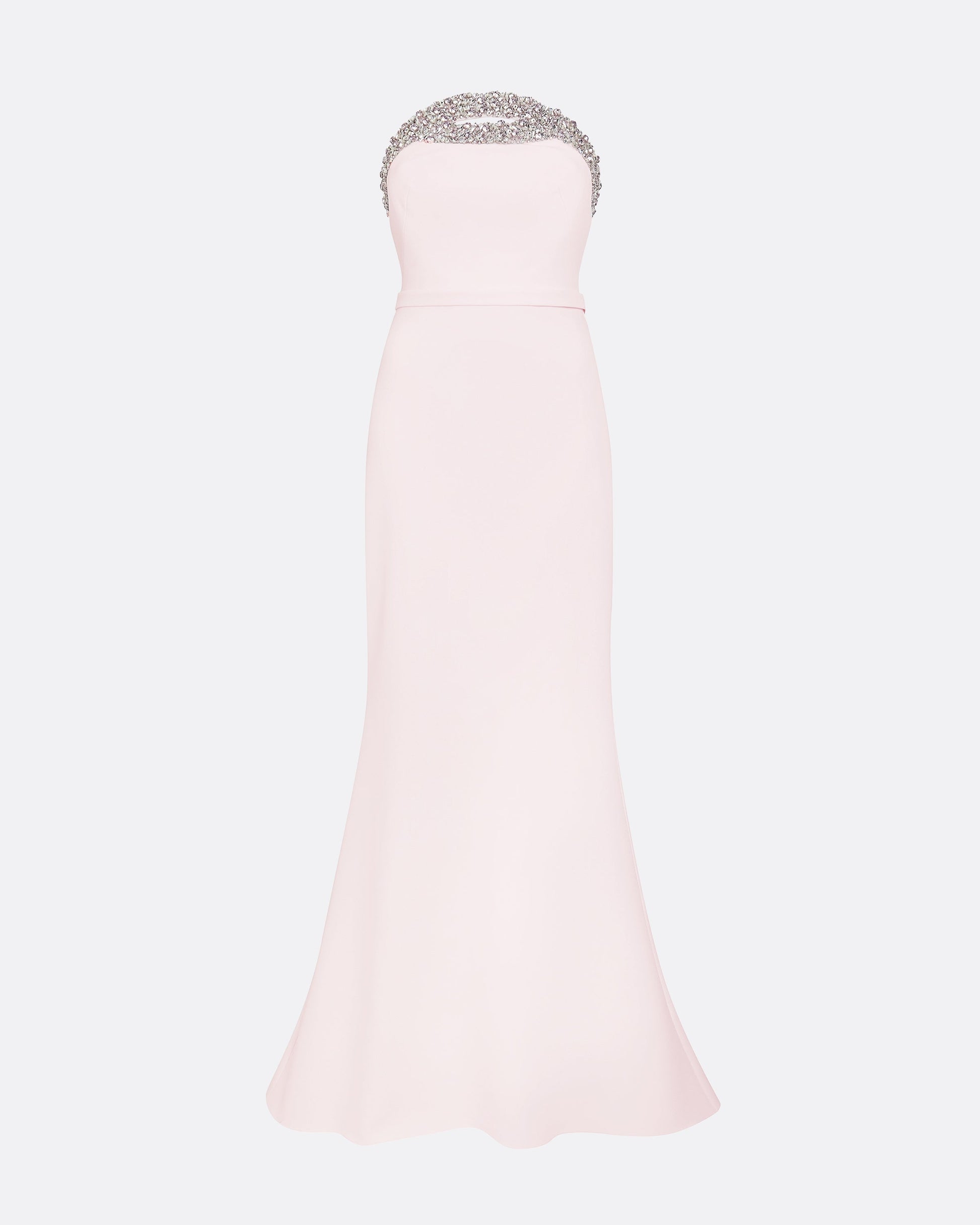 Floor length gown with fishtail skirt and rounded, cut out neckline in barely pink with multi-pinks Crystal Trim embroidery.