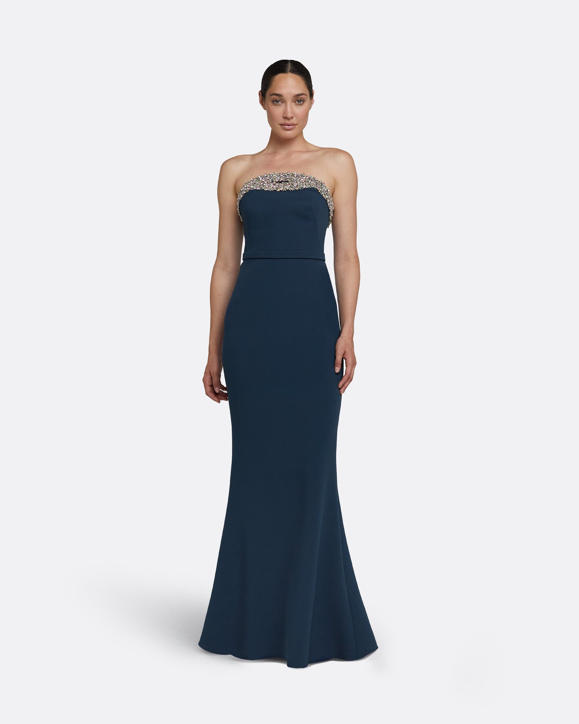 Floor length gown with fishtail skirt and rounded, cut out neckline in ink blue Heavy Crepe with multi-pastels Crystal Trim embroidery.