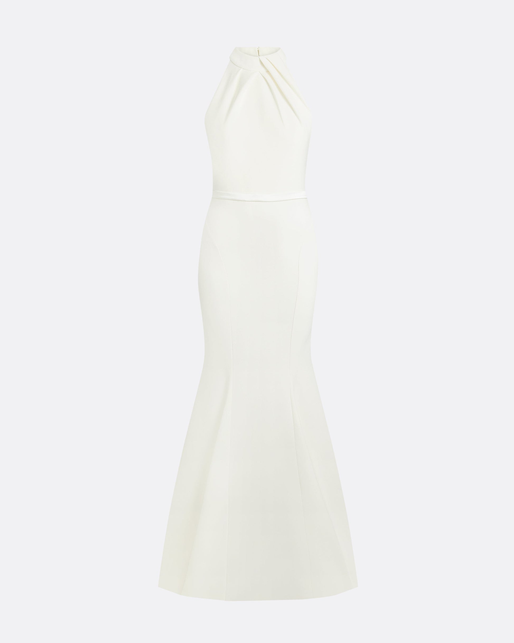 Fishtail gown with intertwined collar detail and cut out back detail in ivory.