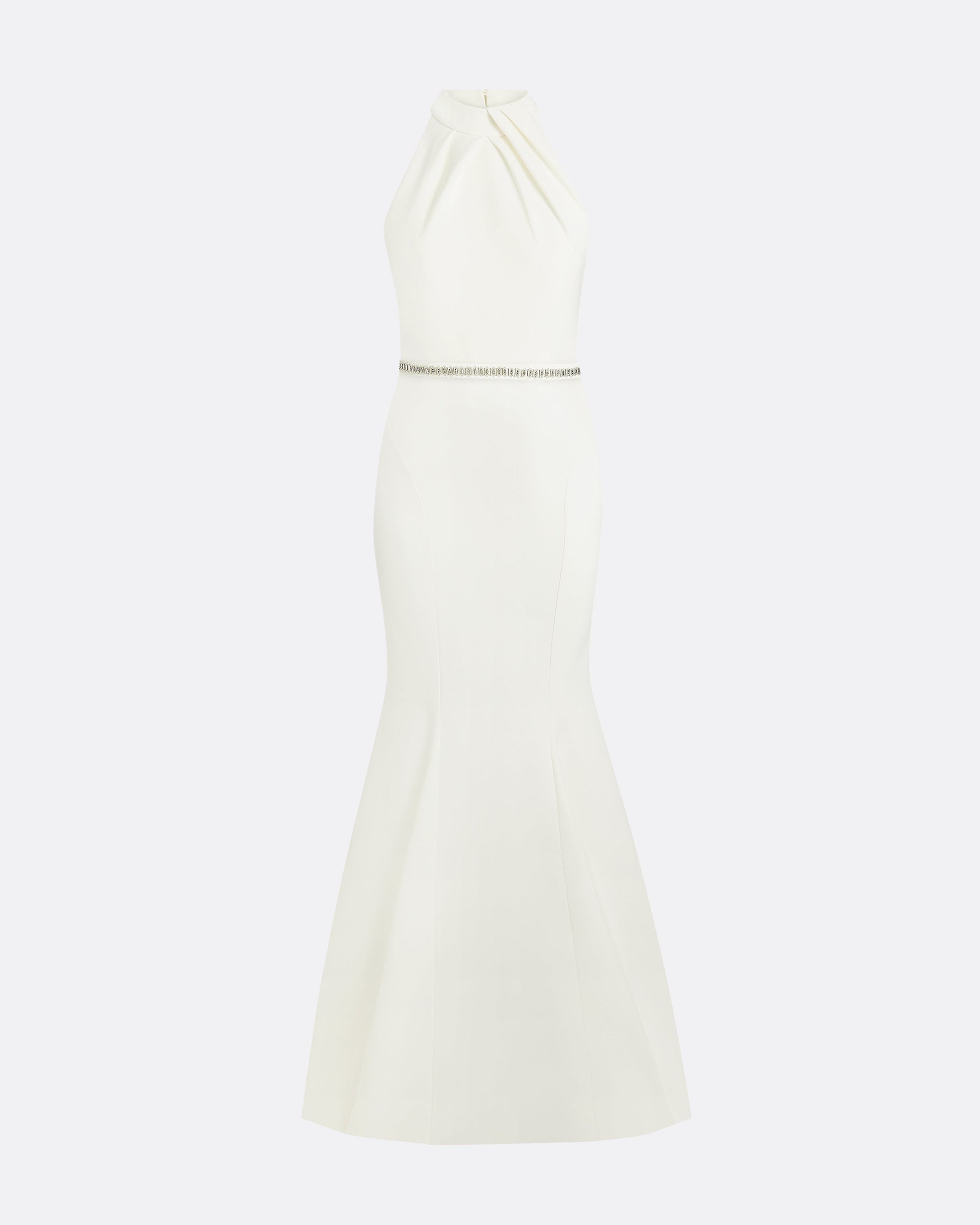 Fishtail gown with intertwined collar detail and cut out back detail in ivory Heavy Crepe.