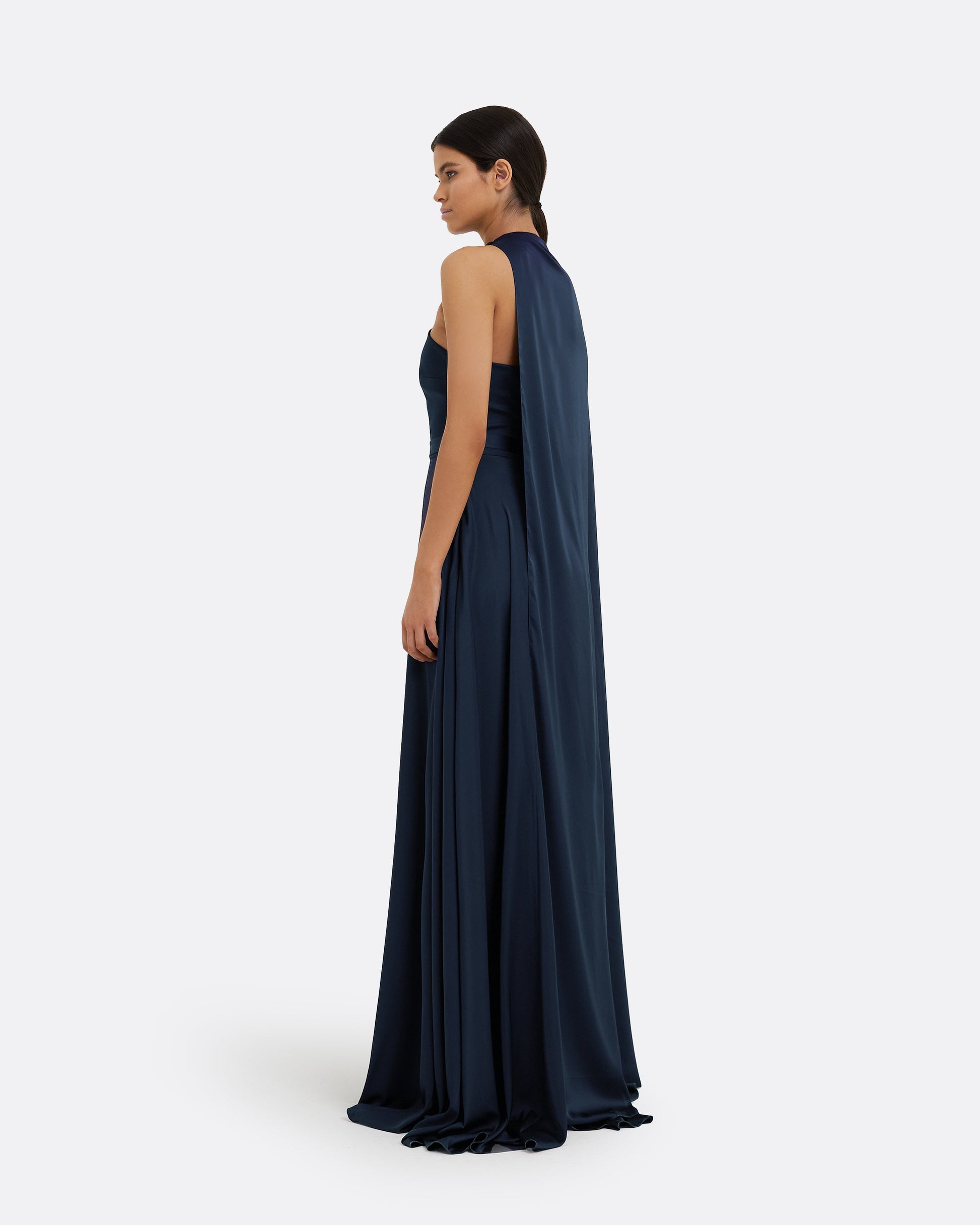 Single floor length caped sleeve gown with halterneck detail in sapphire.