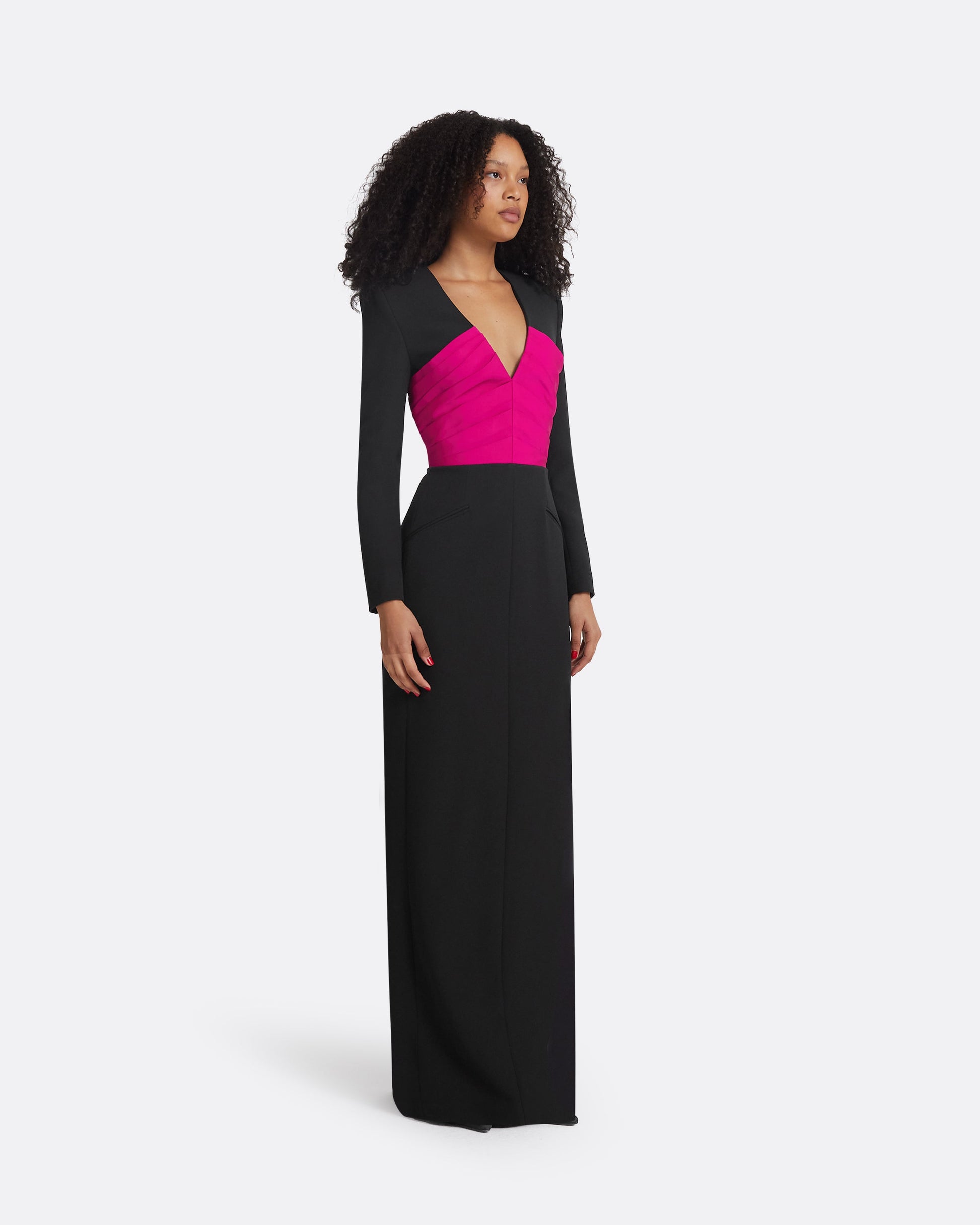 Blazer style gown with column skirt and contrast in beverley Faille on black Heavy Crepe.