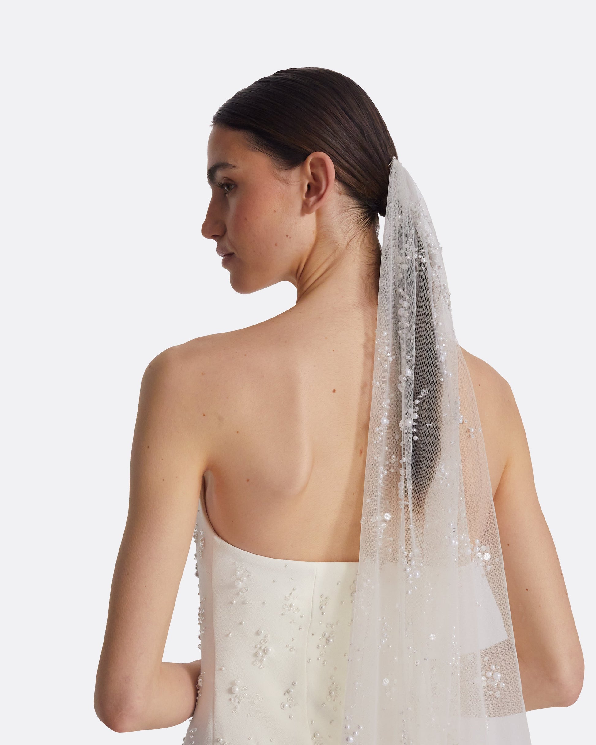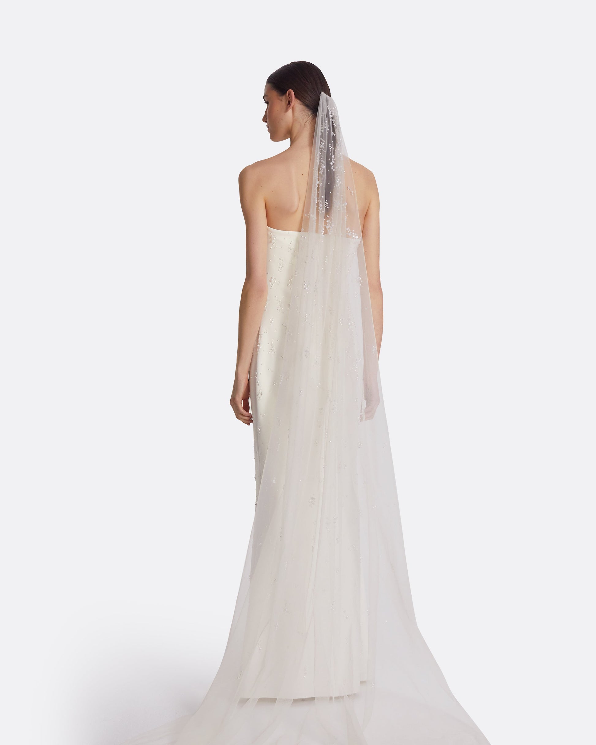 Long line, cascade shaped veil in ivory Tulle with pearl Gypsophilia embroidery.