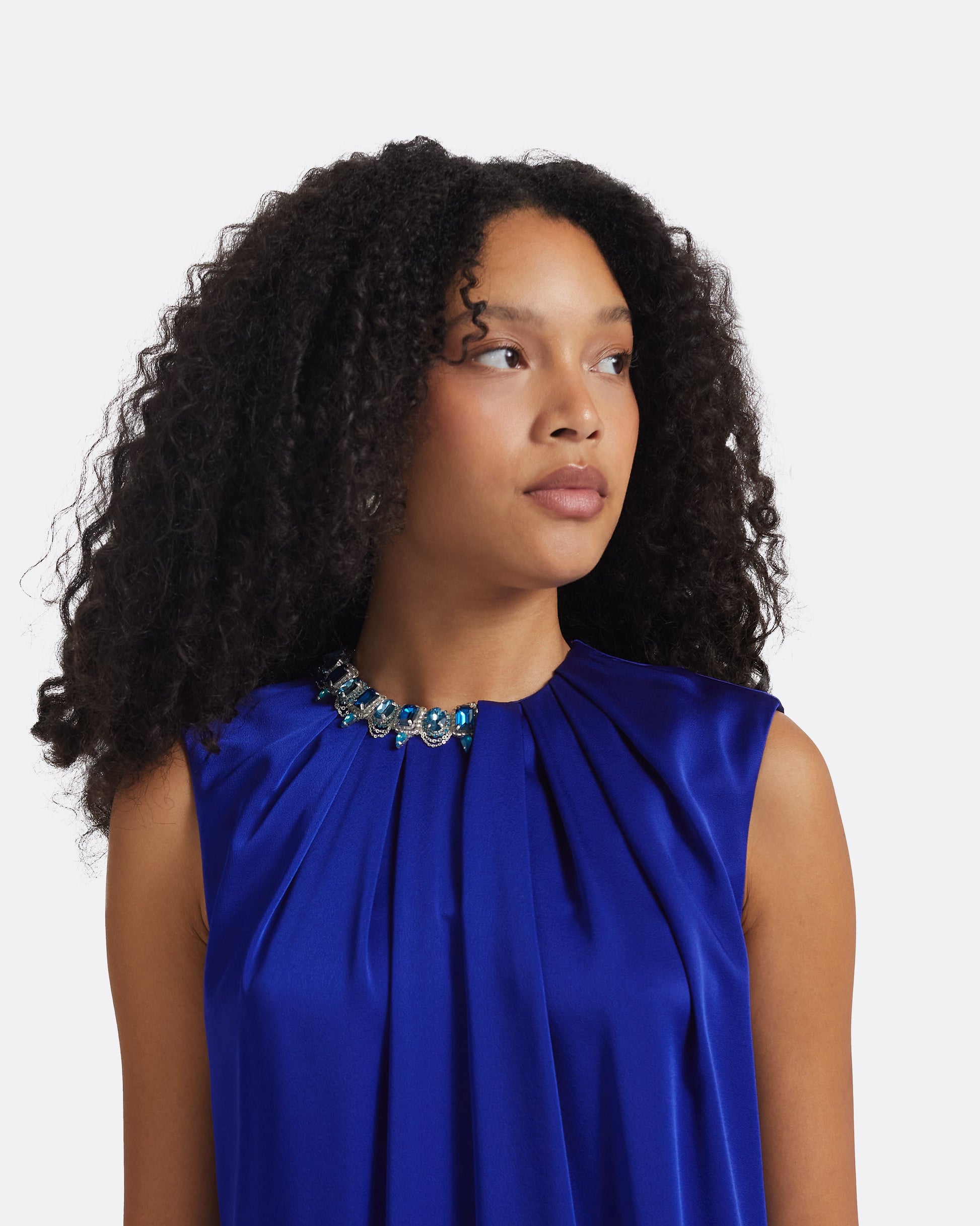 Relaxed gown with pleated neckline and cape in marrakech Light Satin Back Crepe and Adorned Trim Chain embroidery.