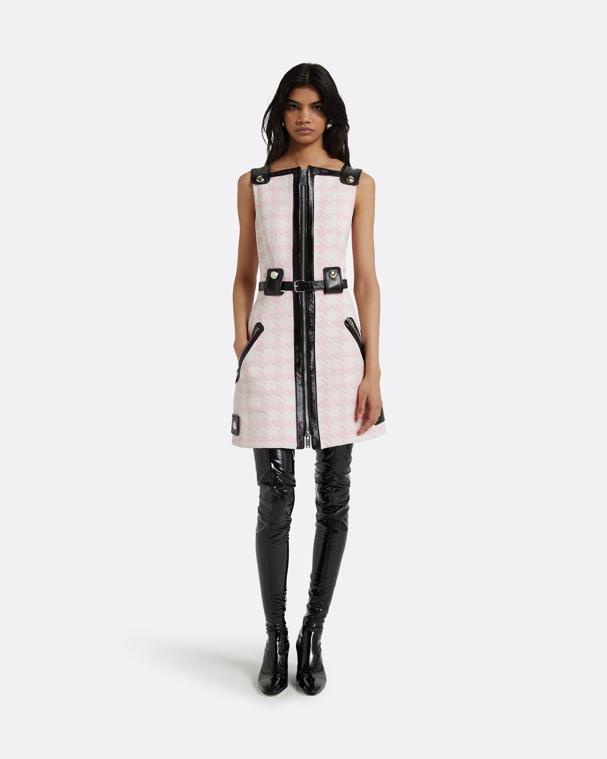 Mini dress with contrast finishings and front zip in black High Shine PU on barely pink Houndstooth.