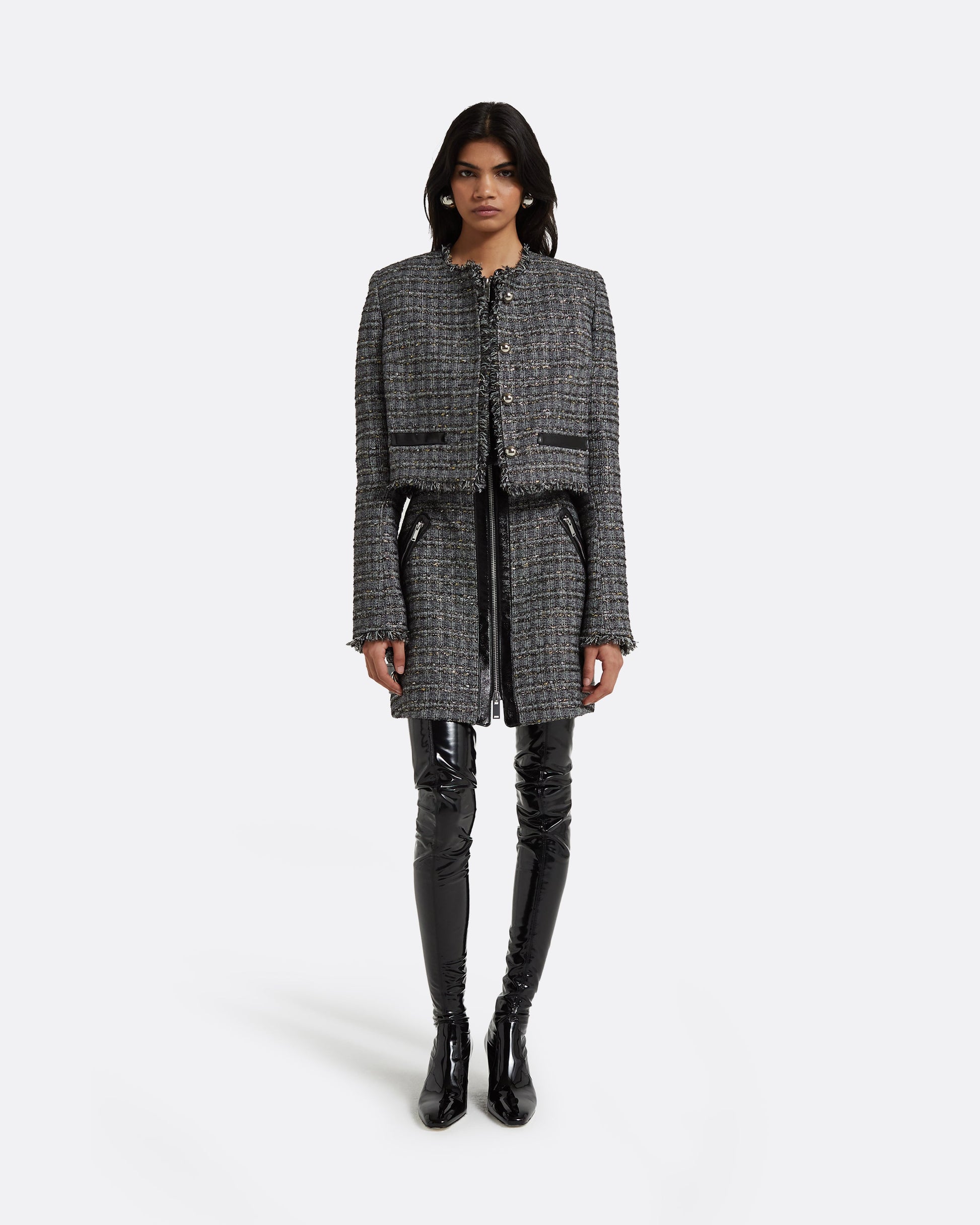 Mini dress with contrast finishings and front zip in black on metallic greyscale Ribbon Tweed and black High Shine PU.