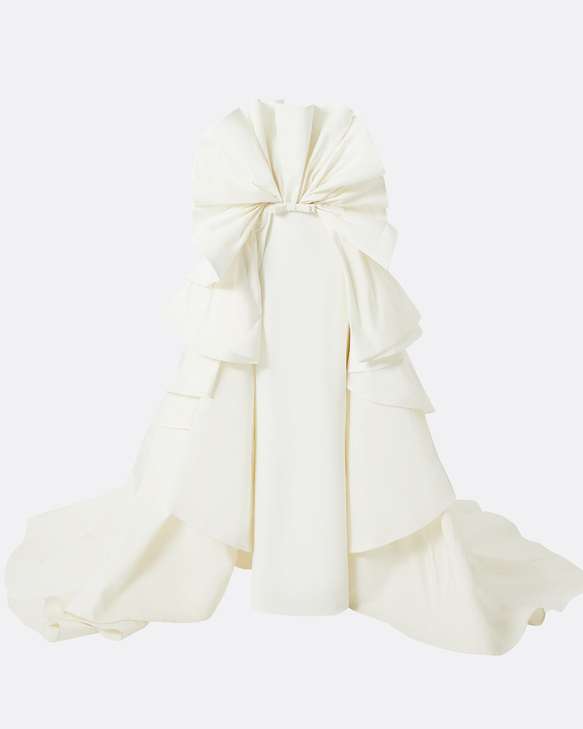 Striking gown with contrast ruffle drape in ivory Heavy Crepe, Faille and Light Satin Back Crepe.