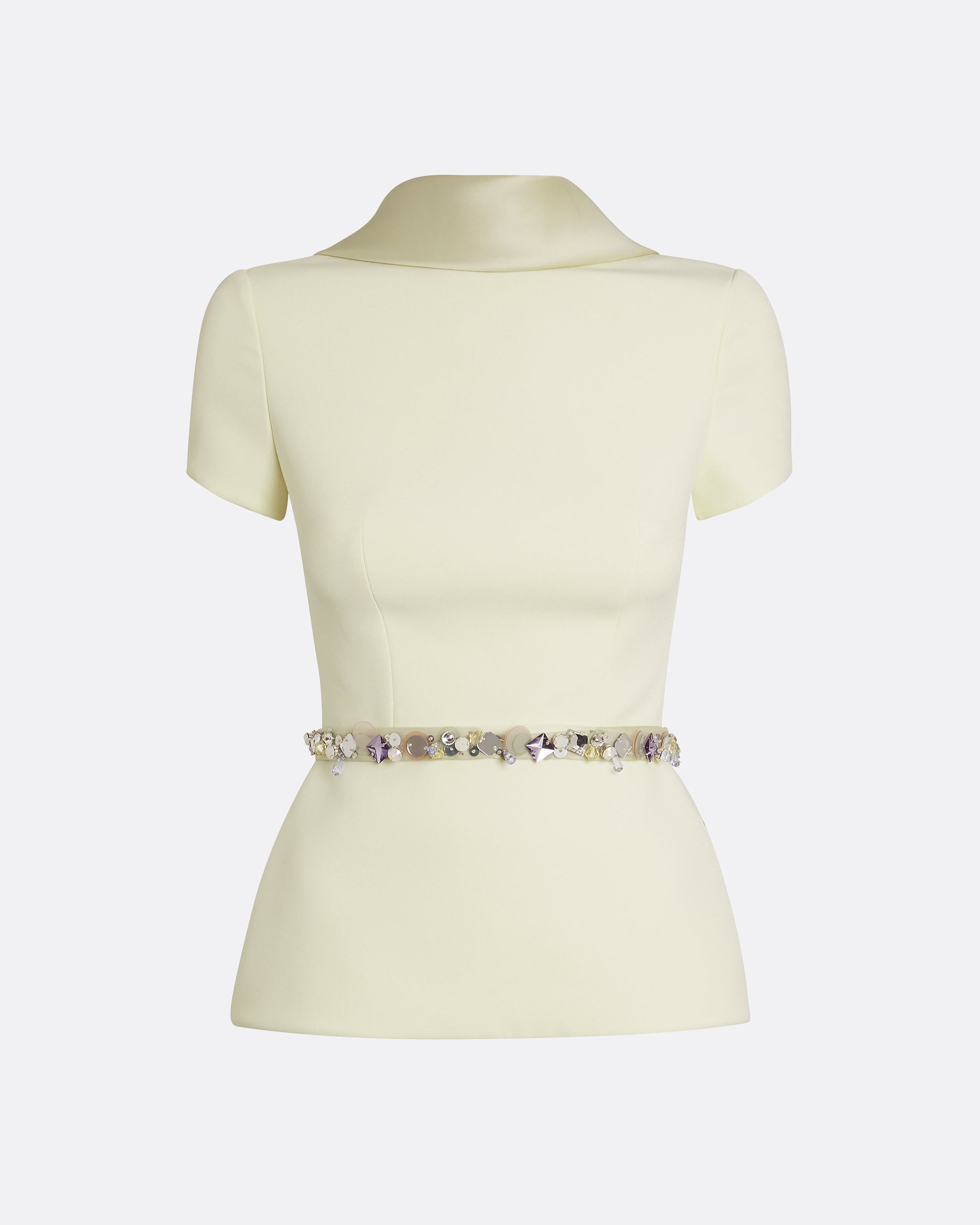 Short sleeve top with peplum and contrast high neck in sorbet Heavy Crepe with multi-pastels Elisabetta Trim embroidery.