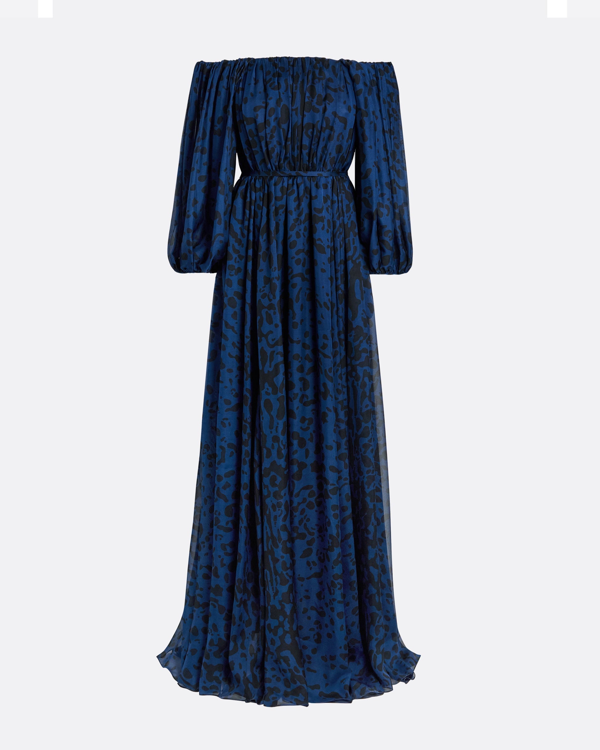 Fluid gown with corsetted off the shoulder neckline and draped, slit sleeves in navy/ black Abstract Animalier Silk Chiffon.