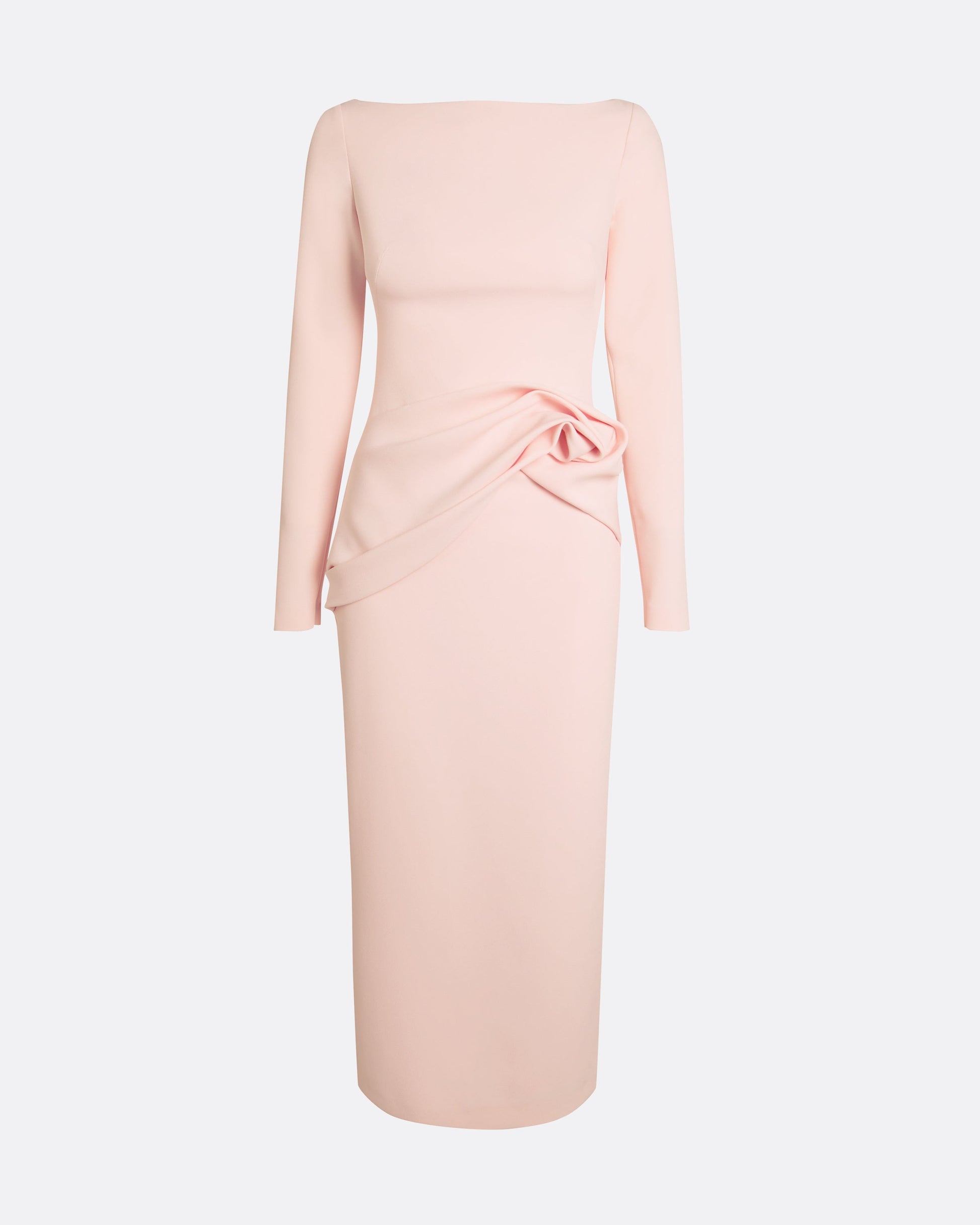 Boat-neck cocktail dress with wave draped peplum in pale pink Heavy Crepe.