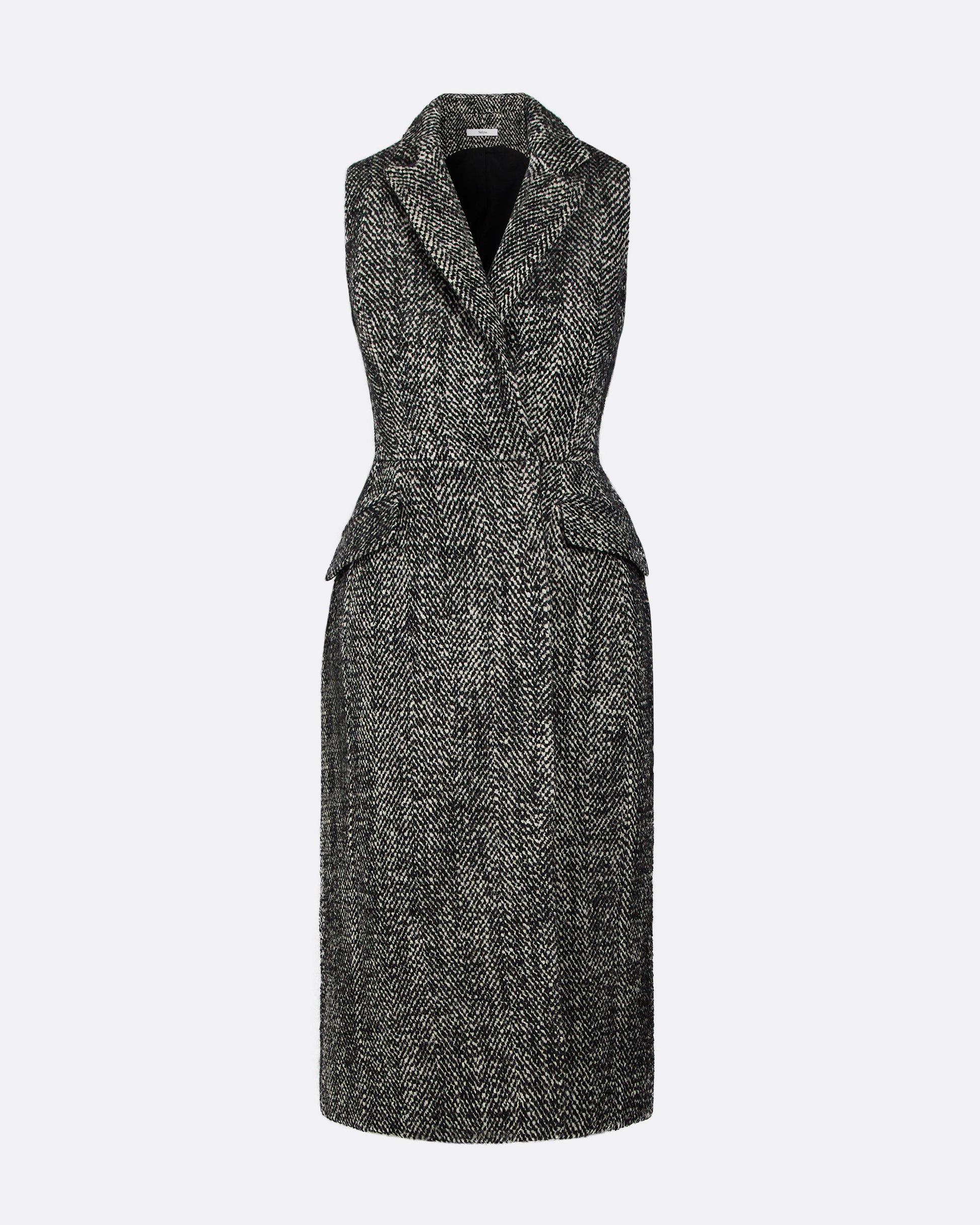 Structured longline waistcoat with lapel and pocket details in black Herringbone Wool.