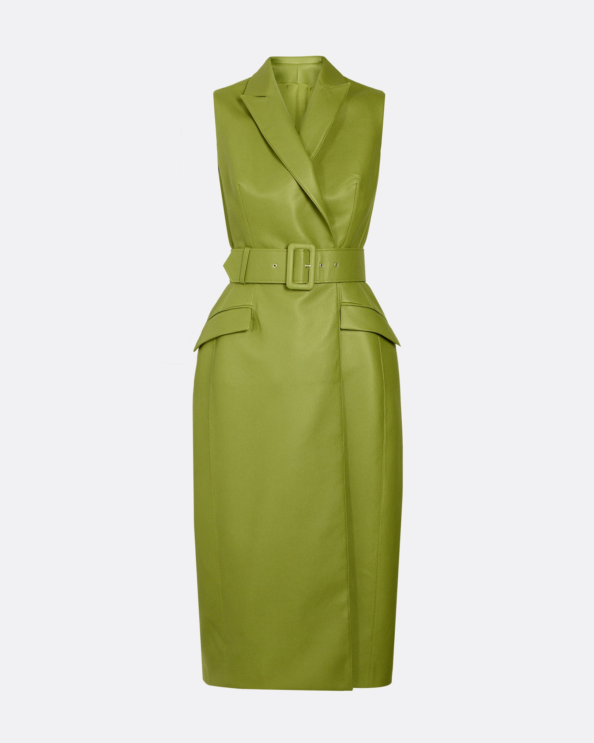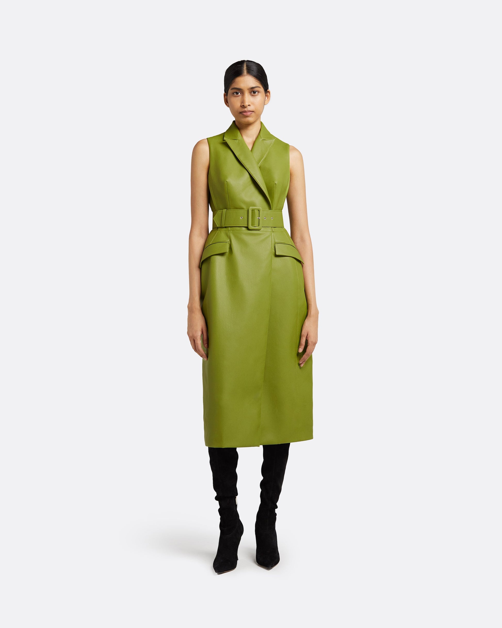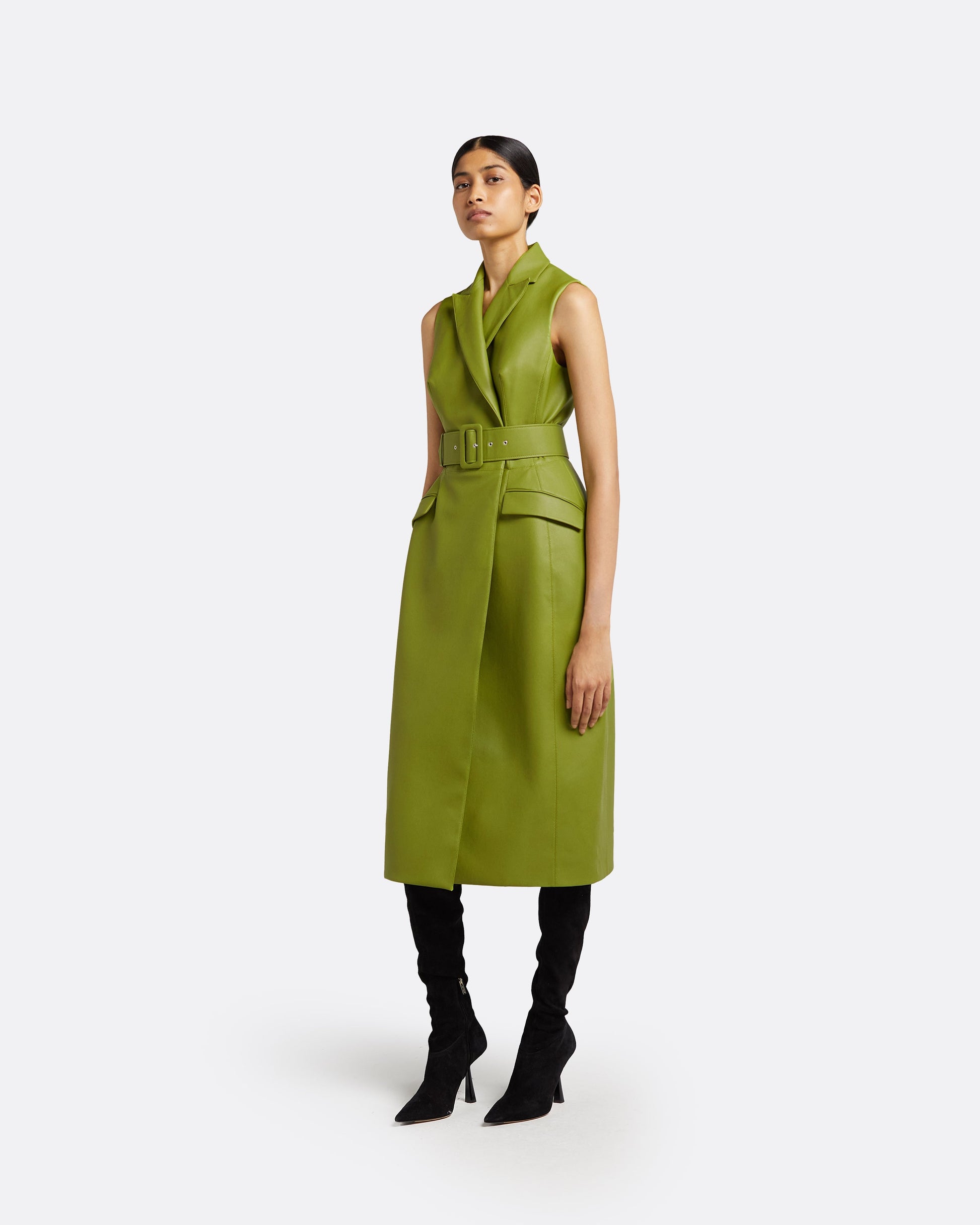 Structured longline waistcoat with lapel and pocket details in woodbine Vegan Leather.