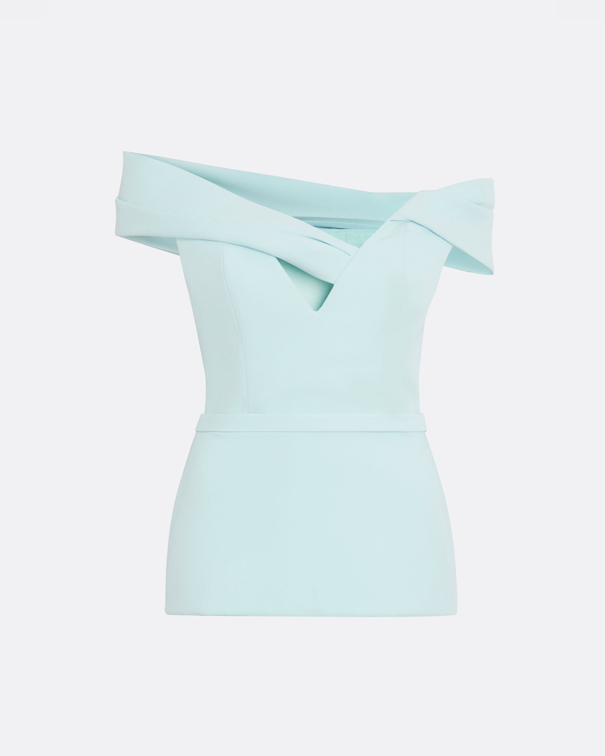 Flattering top with peplum and considered bust drape in baby blue Heavy Crepe.