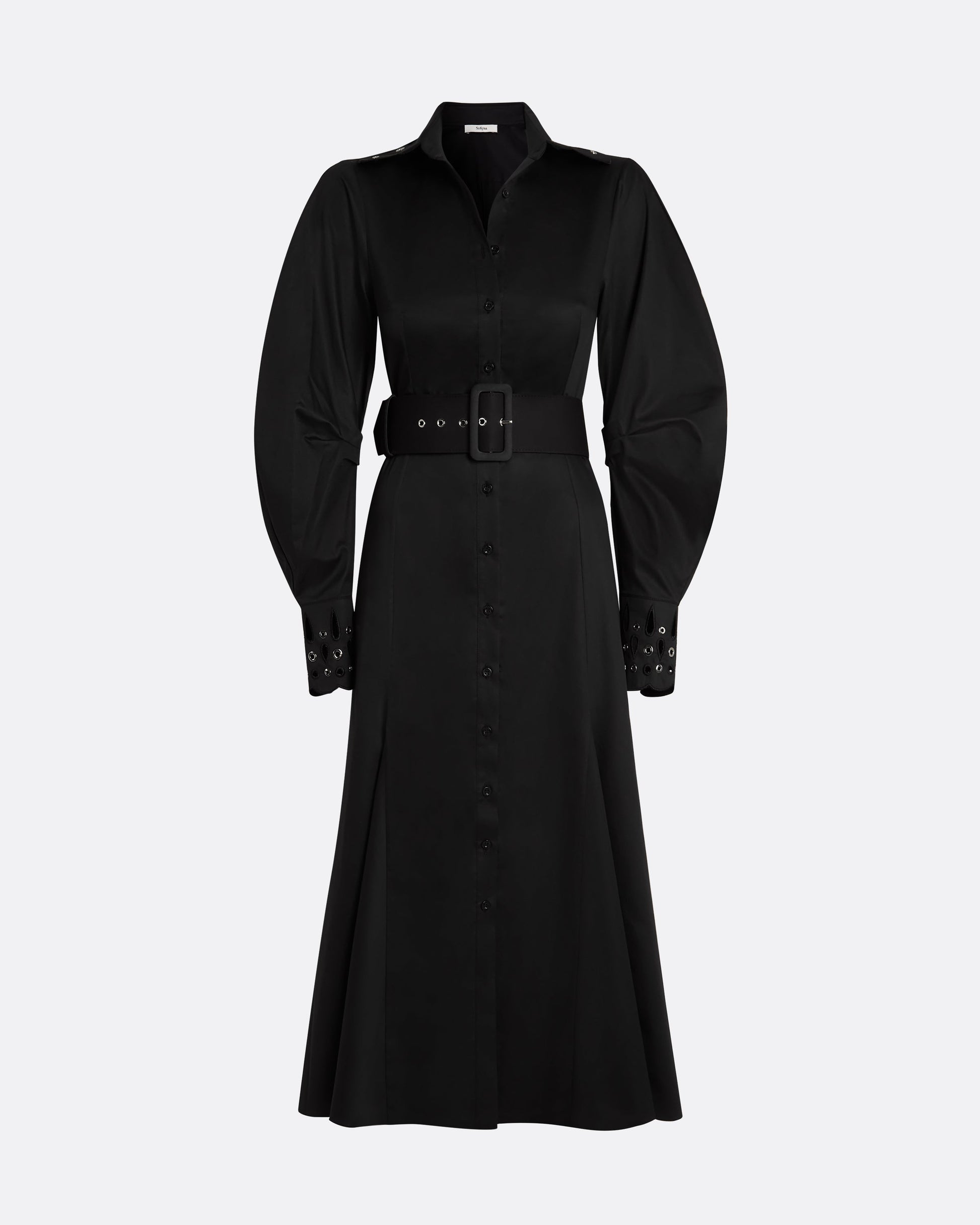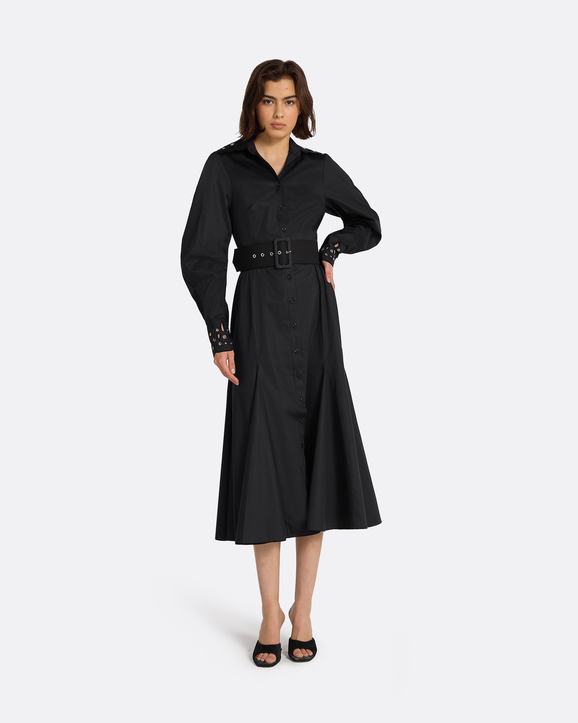Shirt dress with statement sleeve and godet detailing in black Cotton Poplin with silver Anglaise embroidery.