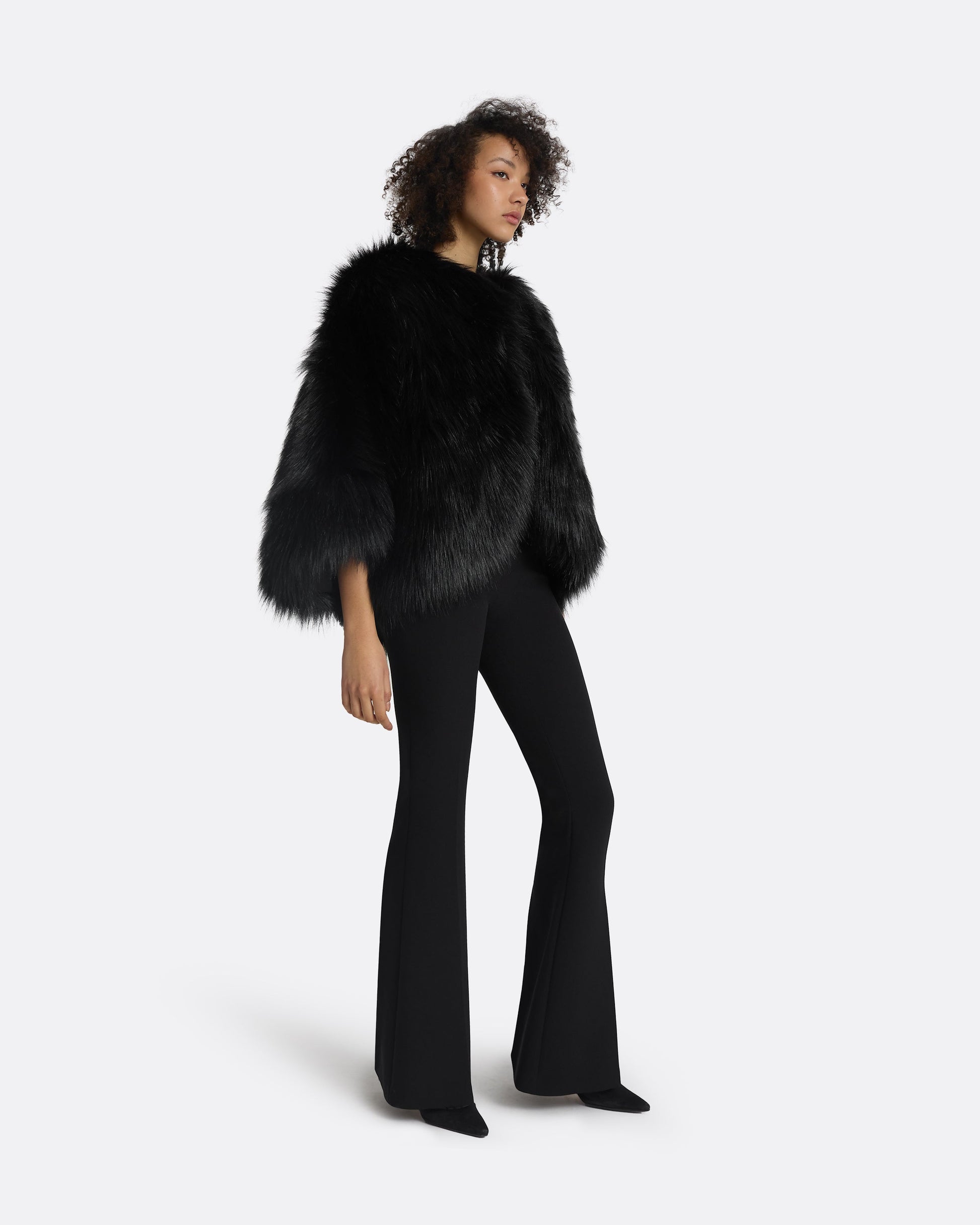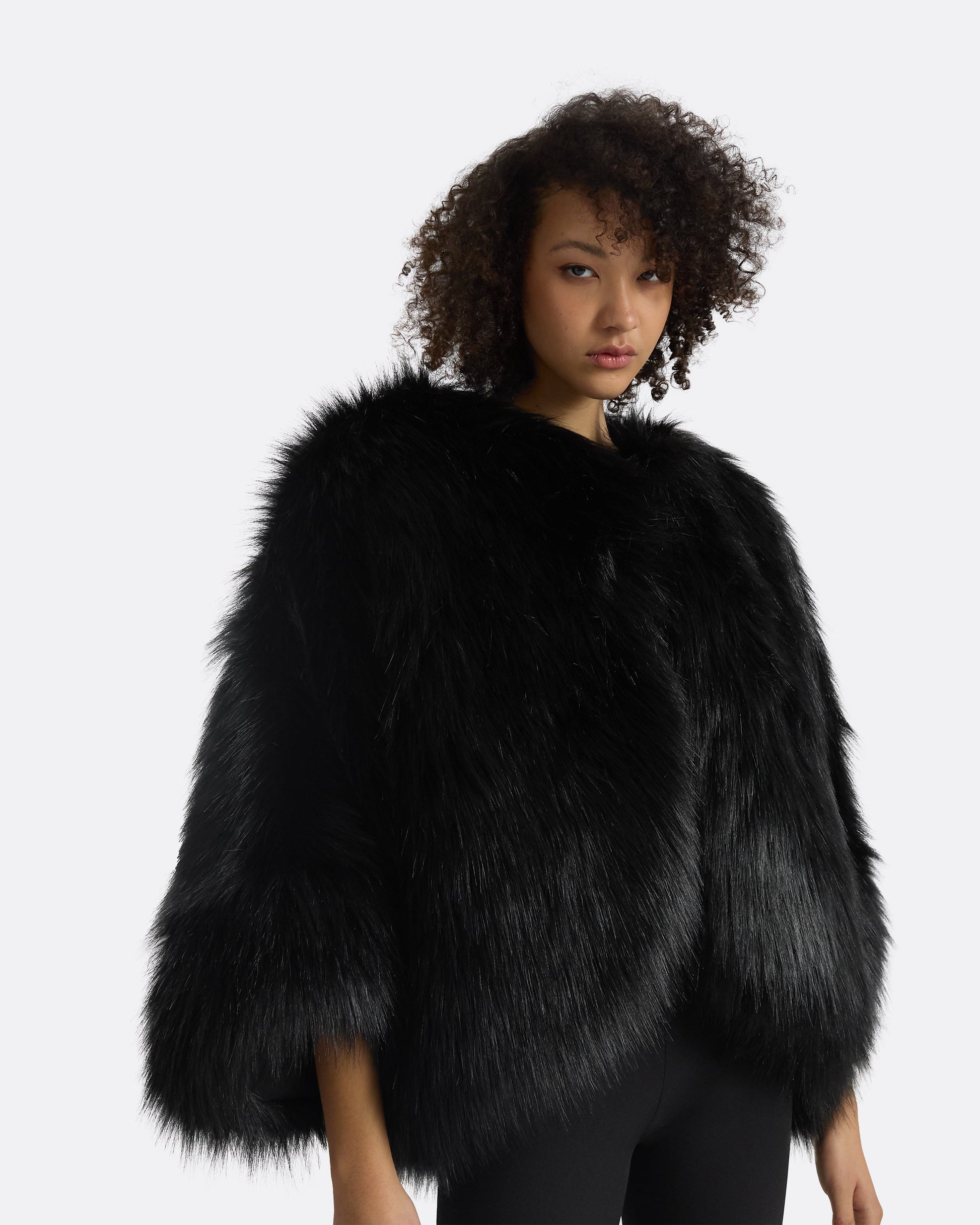 Sculptural, cropped raglan sleeved jacket in black Faux Fox.