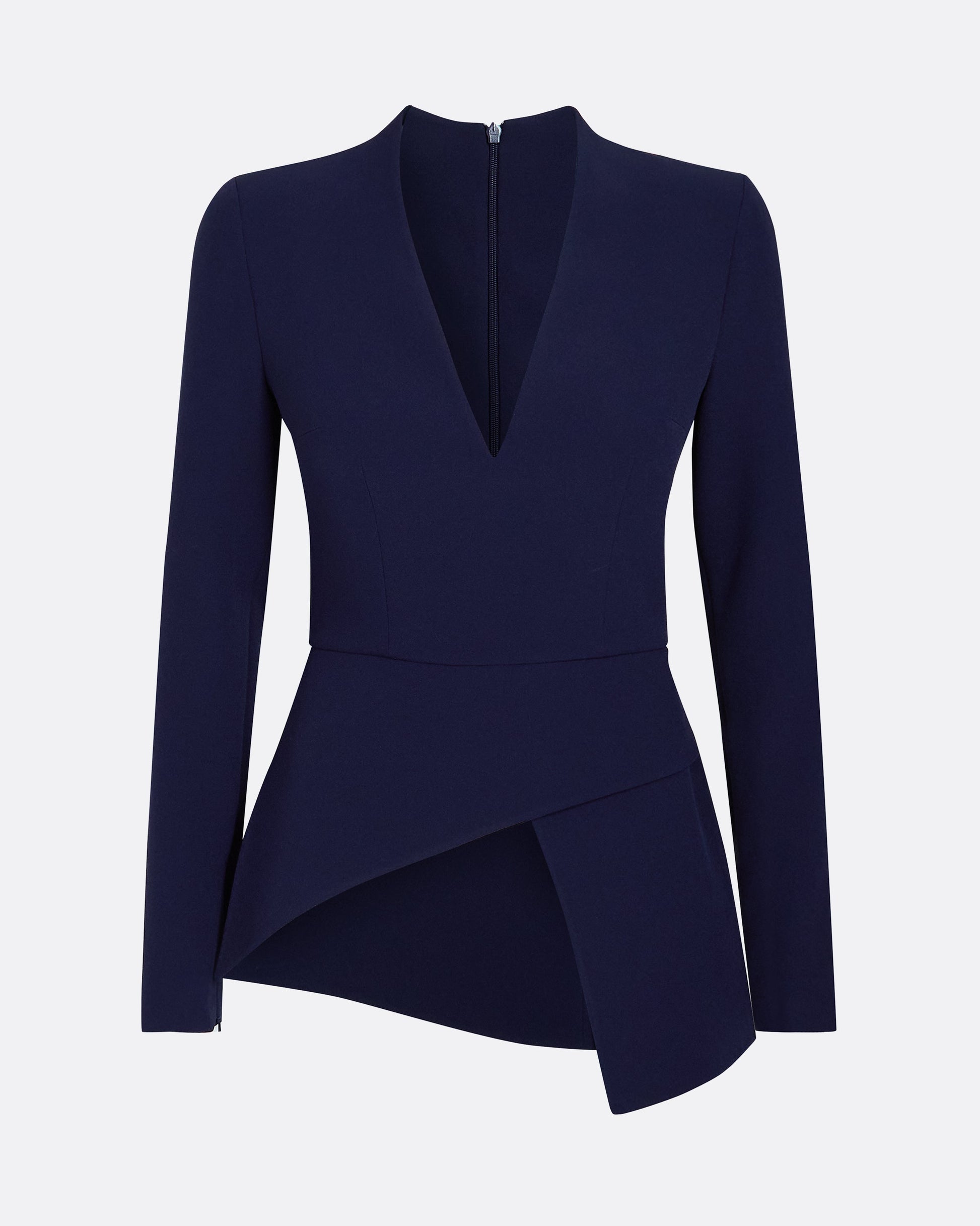 Long sleeve, V neck top with tiered peplum detail in azurite blue.