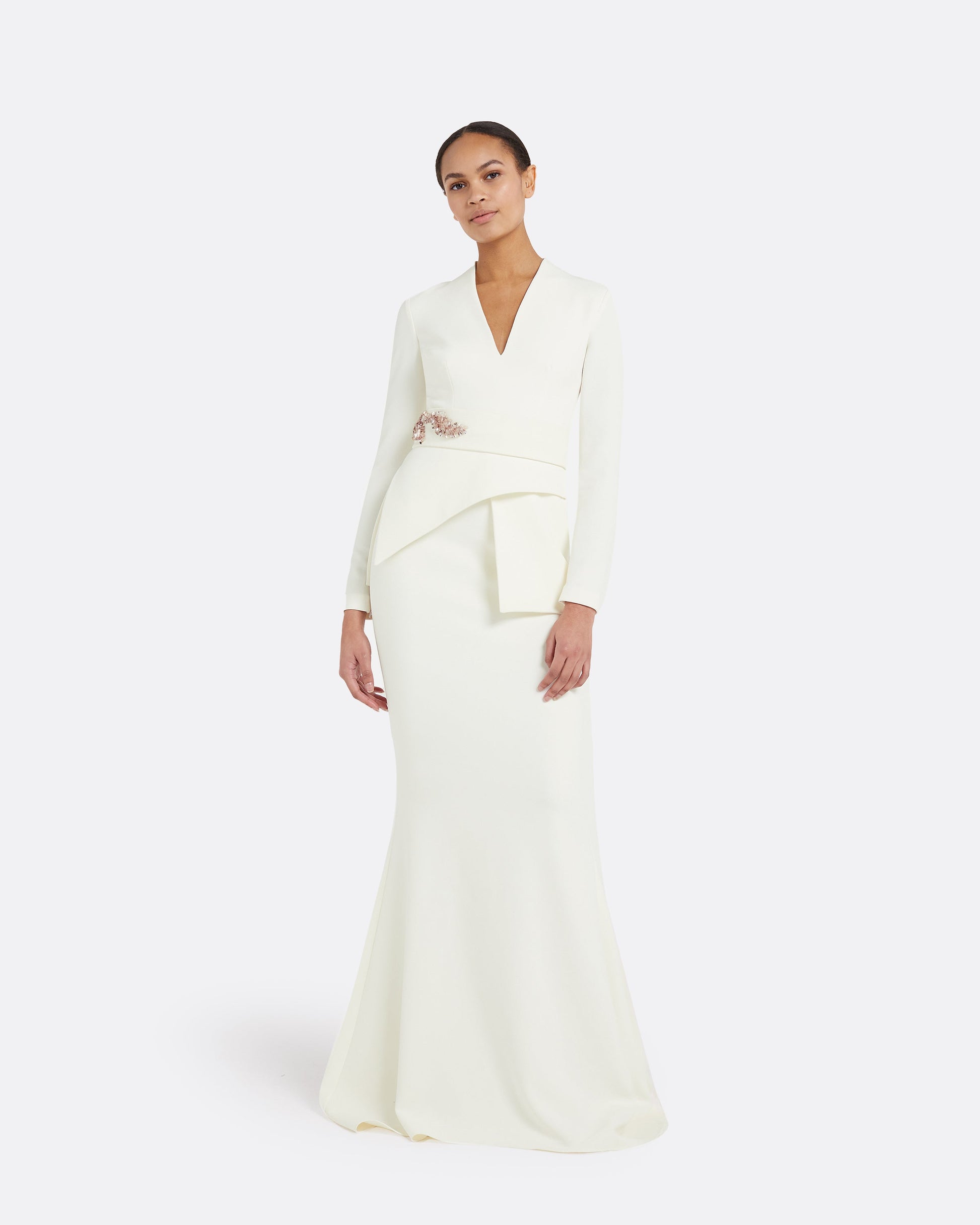 Long sleeve, V neck top with tiered peplum detail in ivory.