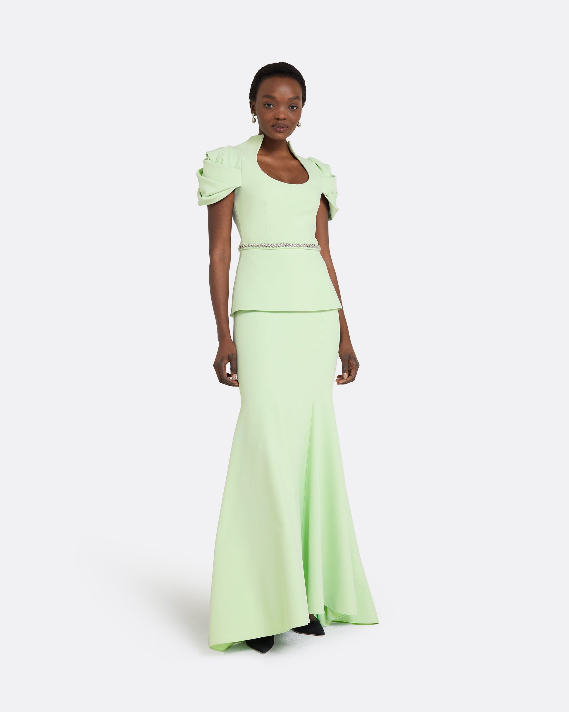 Peplum top with scooped neckline and draped cap sleeves in aloe with crystal Jewel Trim embroidery belt.