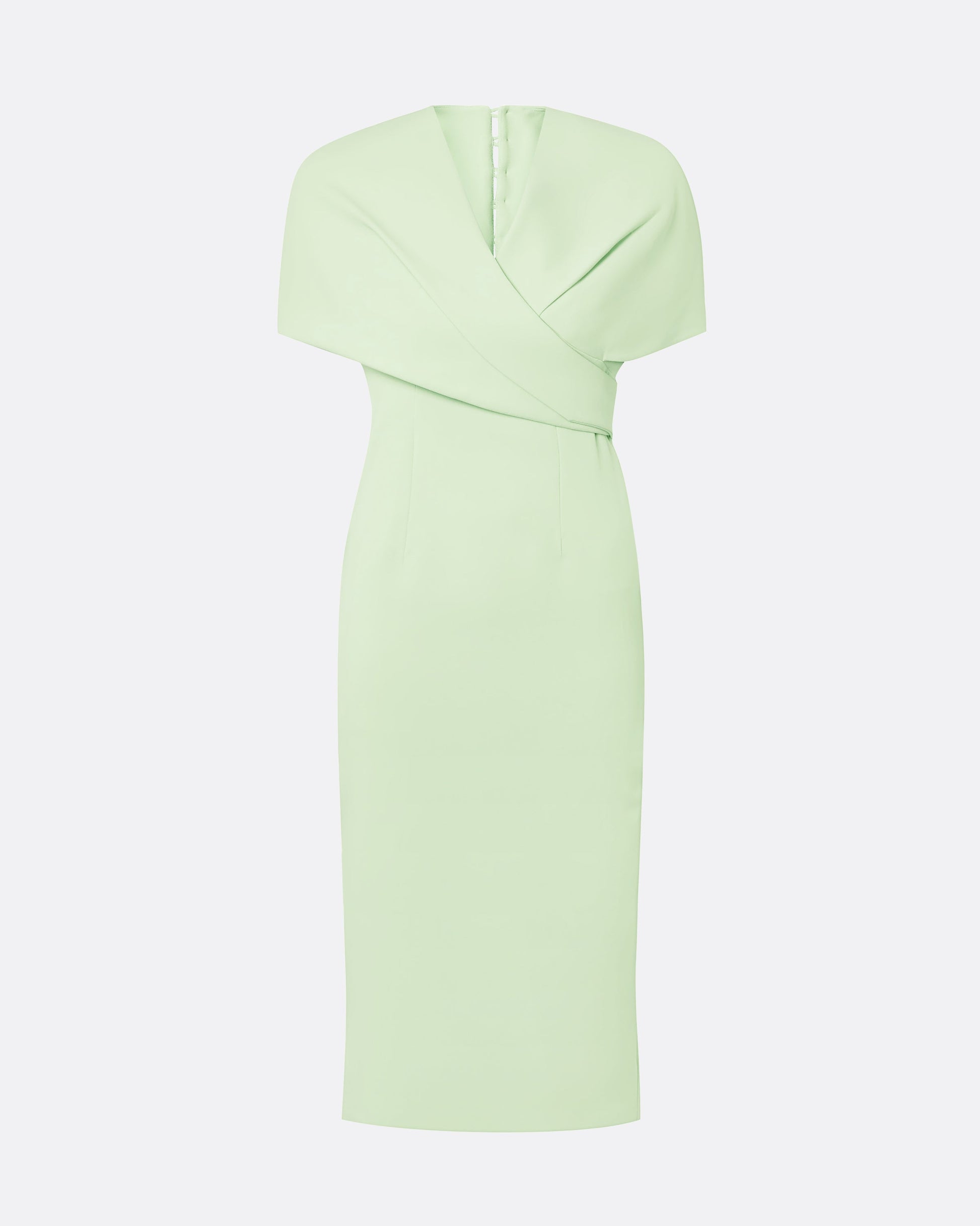 V-neck knee long dress with pleated wrap top in aloe Heavy Crepe.