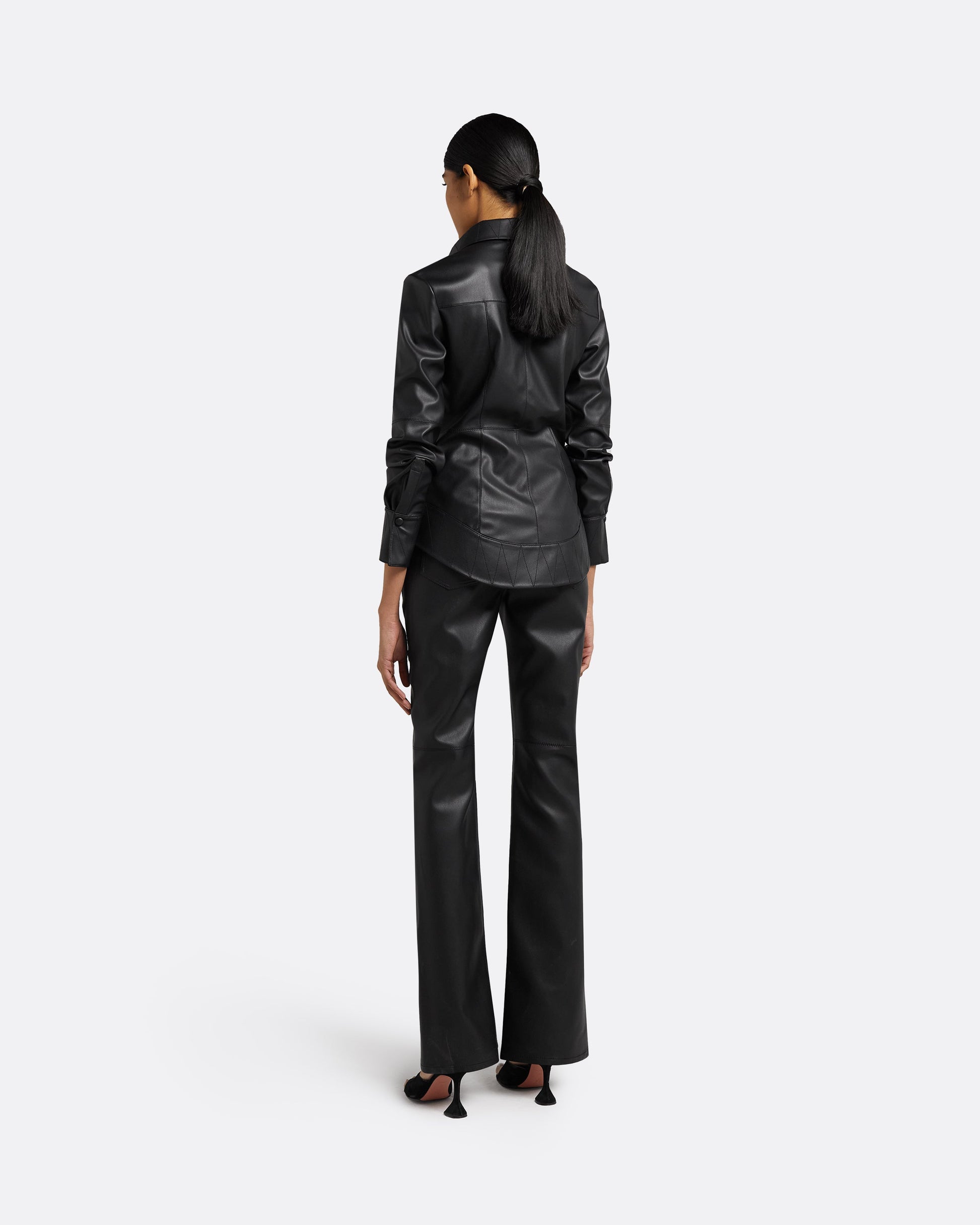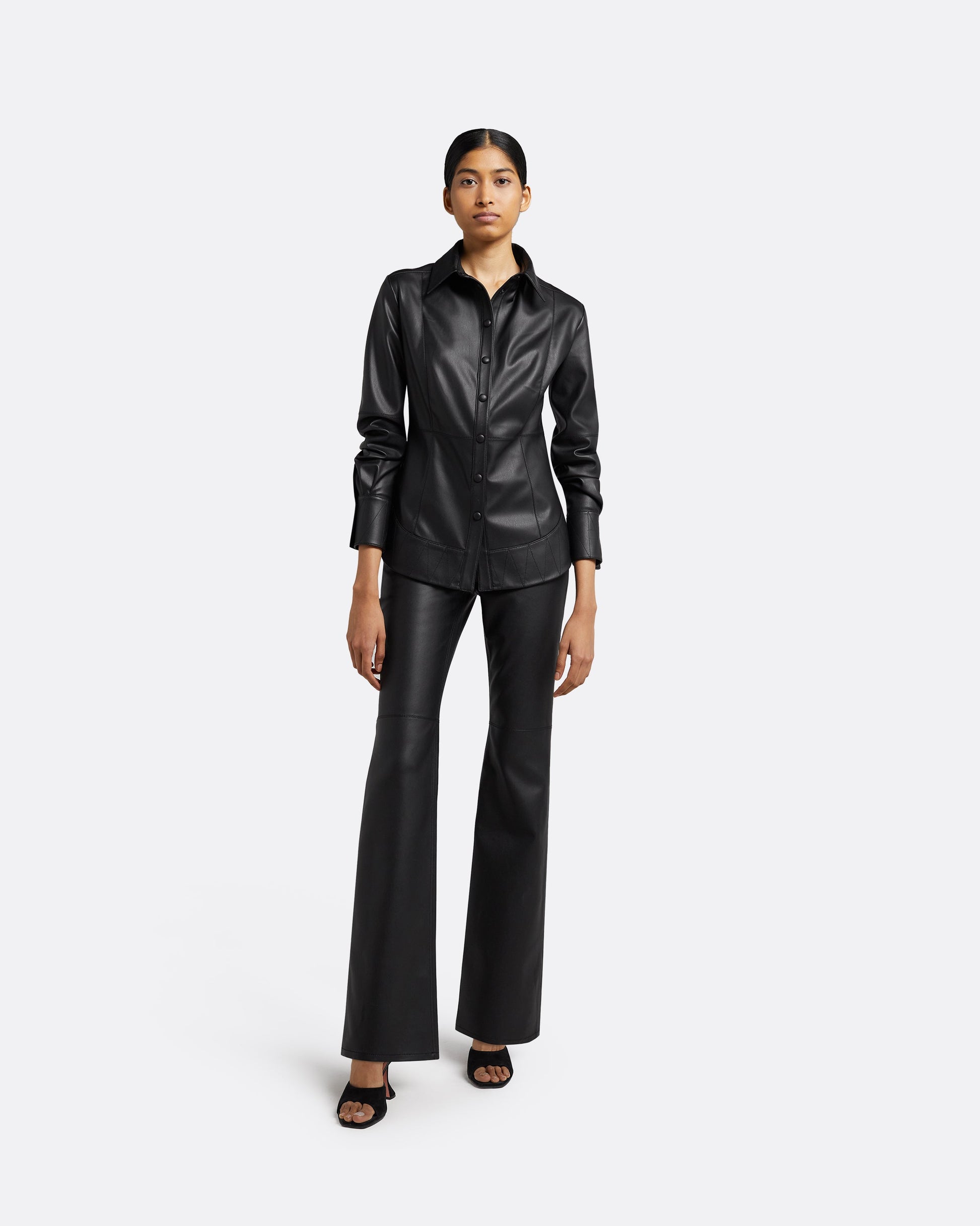 Semi high waist trouser with mild flare leg and pockets in black Vegan Leather.