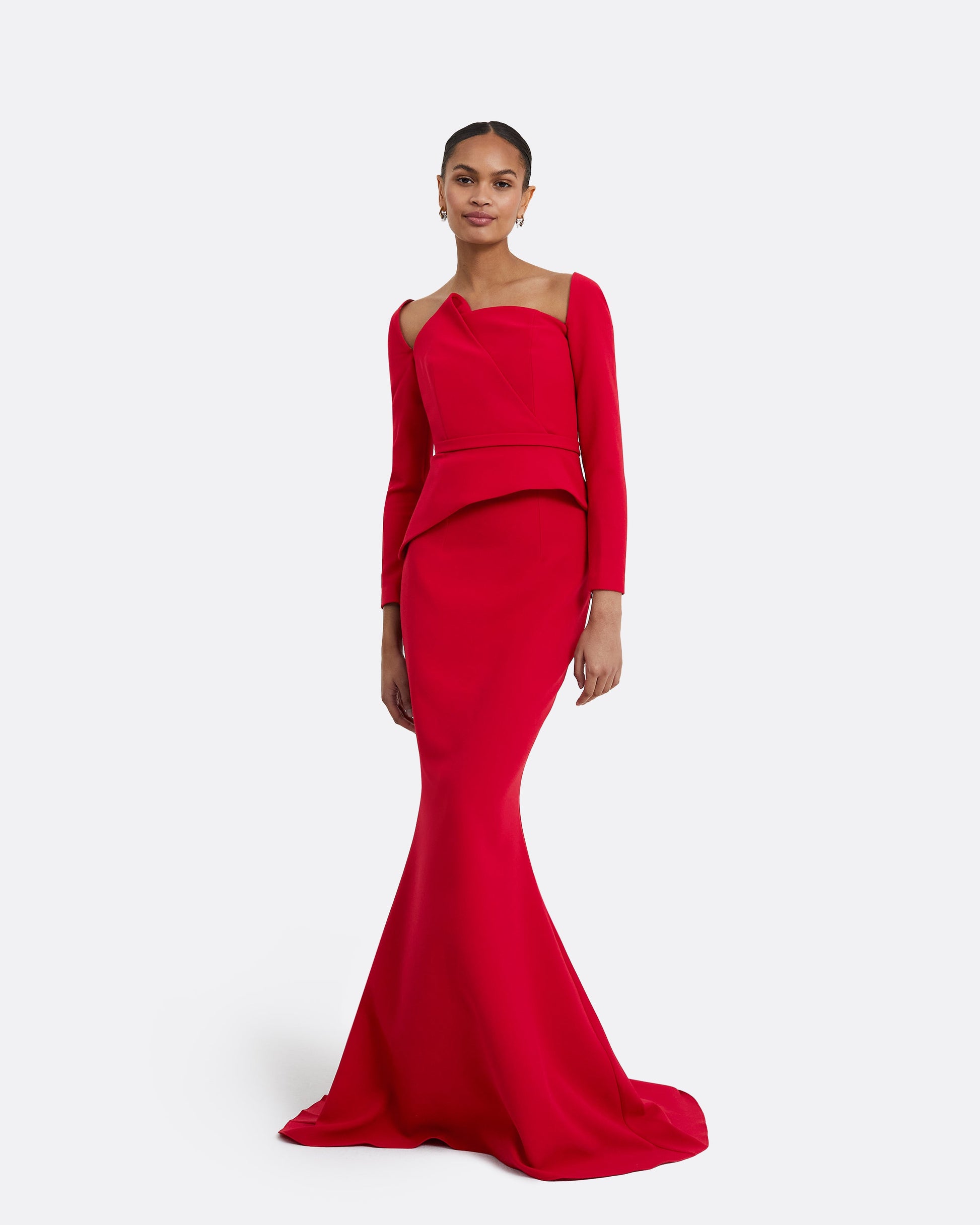 High waisted, fishtail long skirt in crimson.
